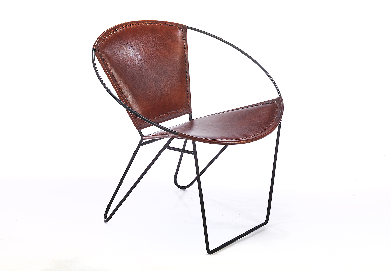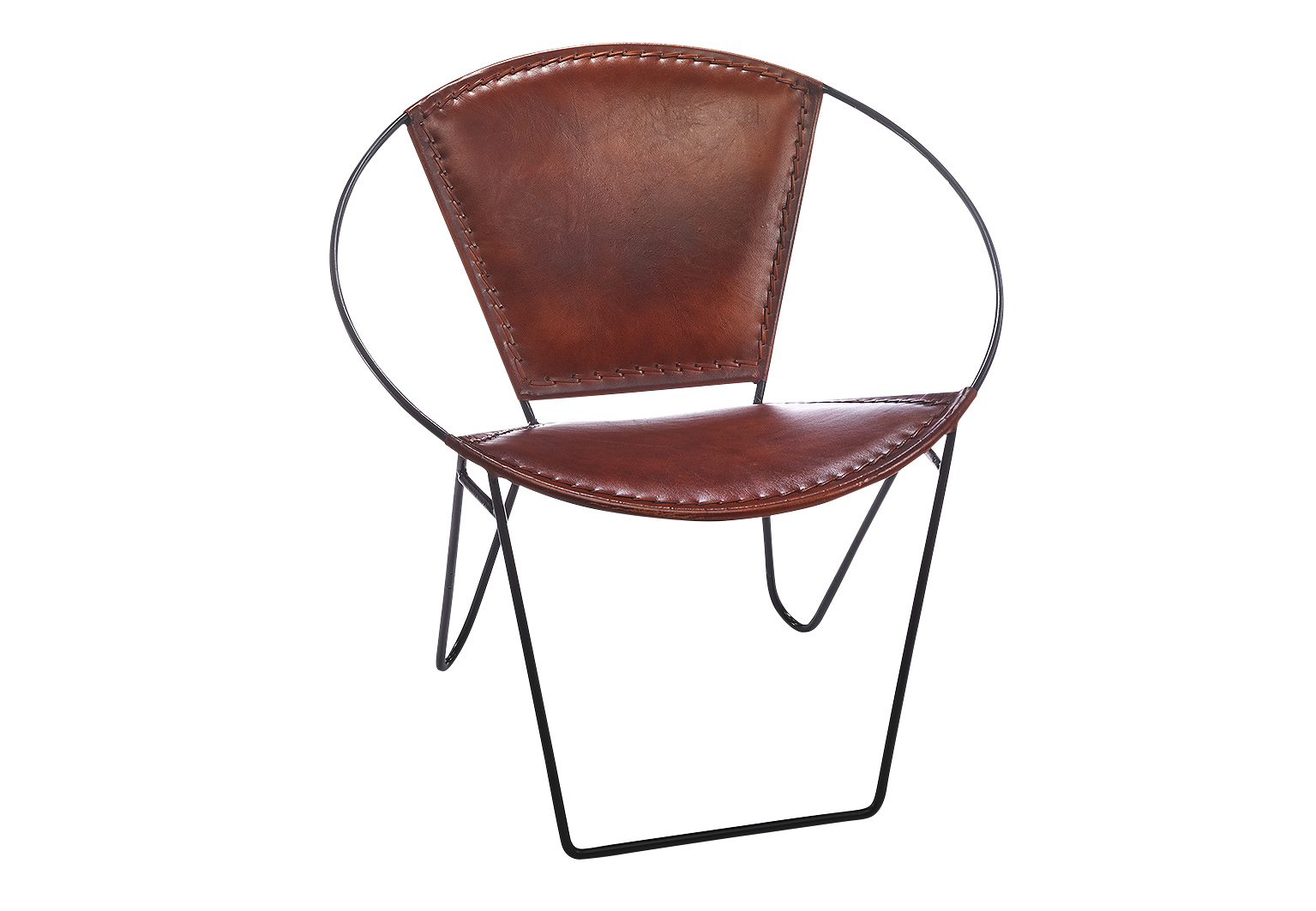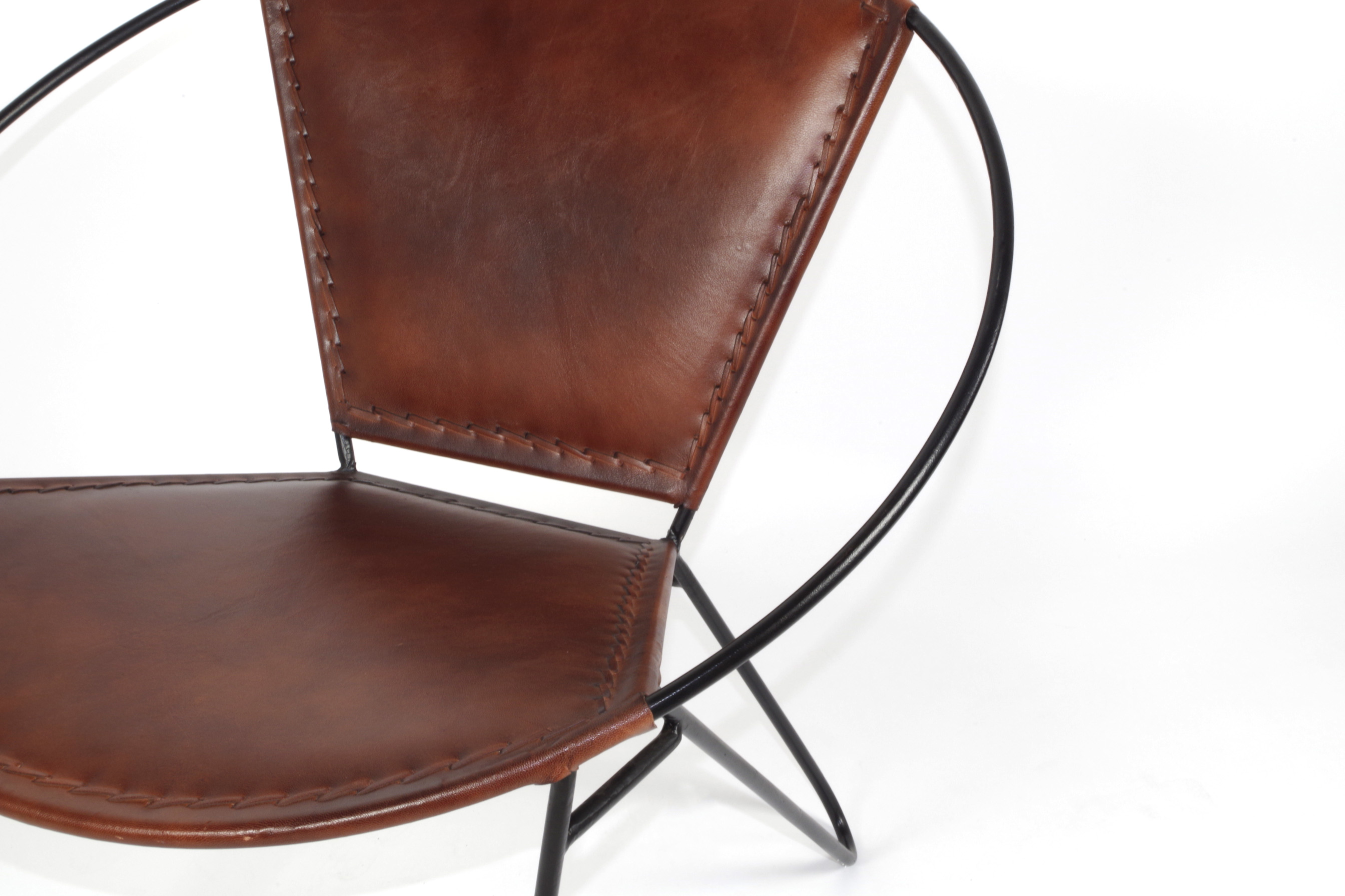 Dekorativer Stuhl aus braunem Leder mit umlaufender Armlehne von kobolo. Der extravagante Stuhl im 70er-Jahre-Design wird zum Blickfang in jedem Ambiente und lädt zum verweilen ein. Perfekt als Warte- oder Besprechungsstuhl für Ihre Geschäftsräume oder als Aufwertung einzelner Bereiche in Ihrem Zuhause. Länge 62cm x Breite 77cm x Höhe 74cm