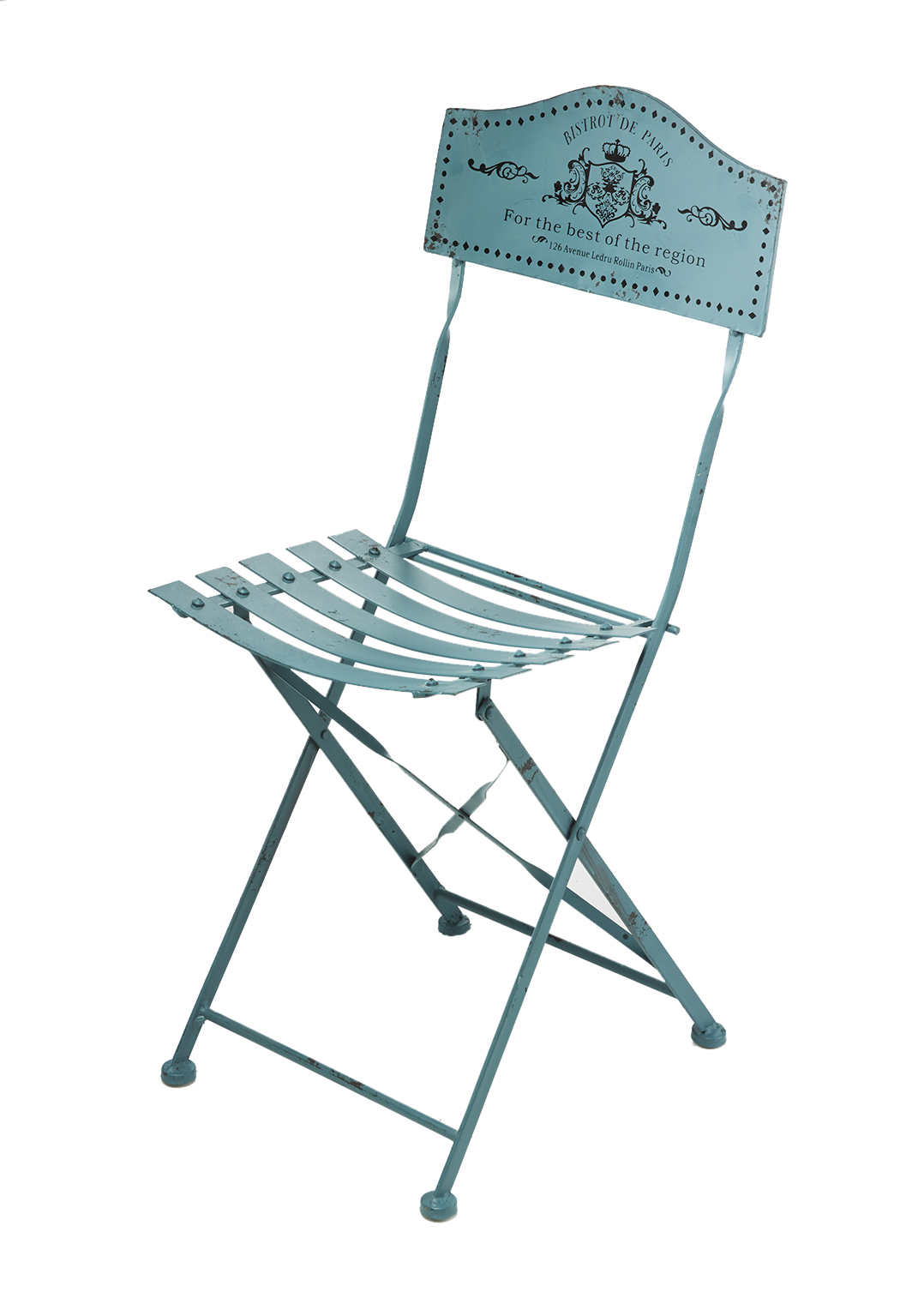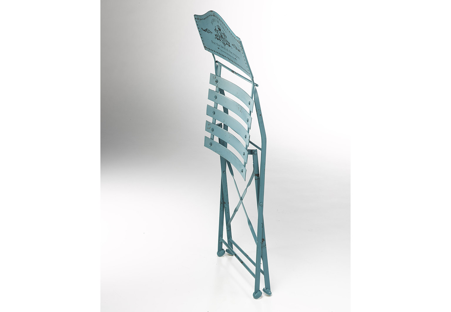 Dekorativer Metallstuhl von Kobolo aus Metall in der Farbe Türkis . Ein Blickfang der nicht nur auf Ihrem Balkon für edles Ambiente sorgt. Ein außergewöhnliches Highlight zur Dekoration. Dieser Stuhl kann zur Überwinterung platzsparend zusammengeklappt werden. Länge 38cm x Breite 33cm x Höhe 87cm