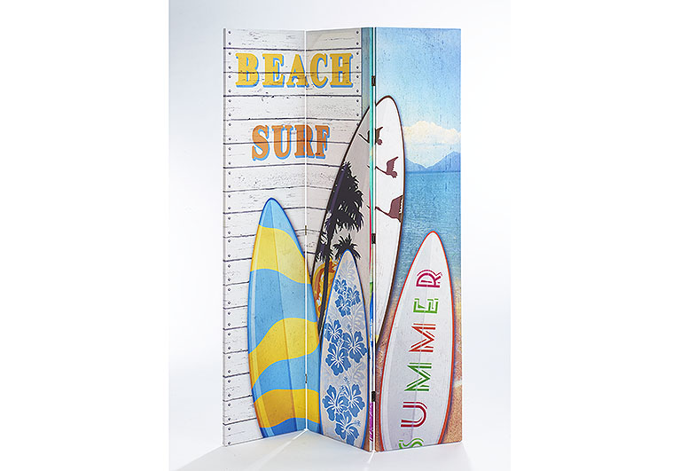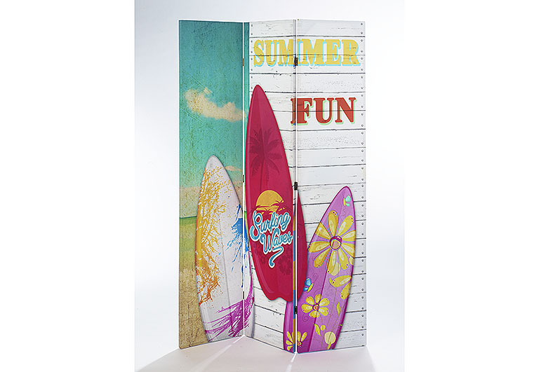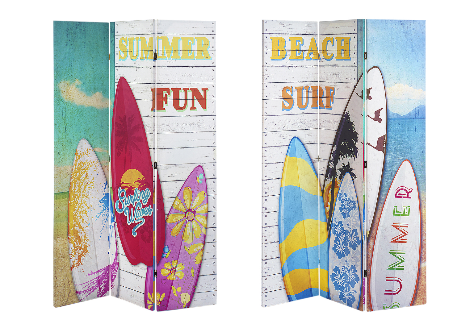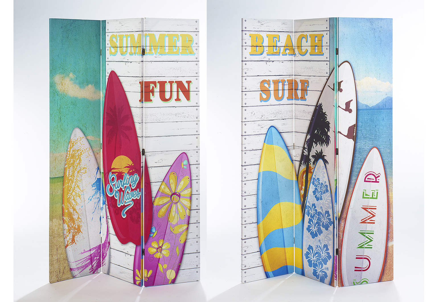 Der 3-teilige Paravent von Kobolo besteht aus einem Holzrahmen, der mit einem Canvasüberzug bespannt ist. Beidseitig in fröhlichen, bunten Farben und mit Surfbrettern bedruckt, verleiht die Spanische Wand jedem Raum eine ausgelassene und entspannte Atmosphäre. Der Paravent besteht aus 3 Teilen, die mit Scharnieren verbunden sind. Jedes Teil ist 40 cm breit und 180 cm hoch. Länge 120cm x Breite 2cm x Höhe 180cm