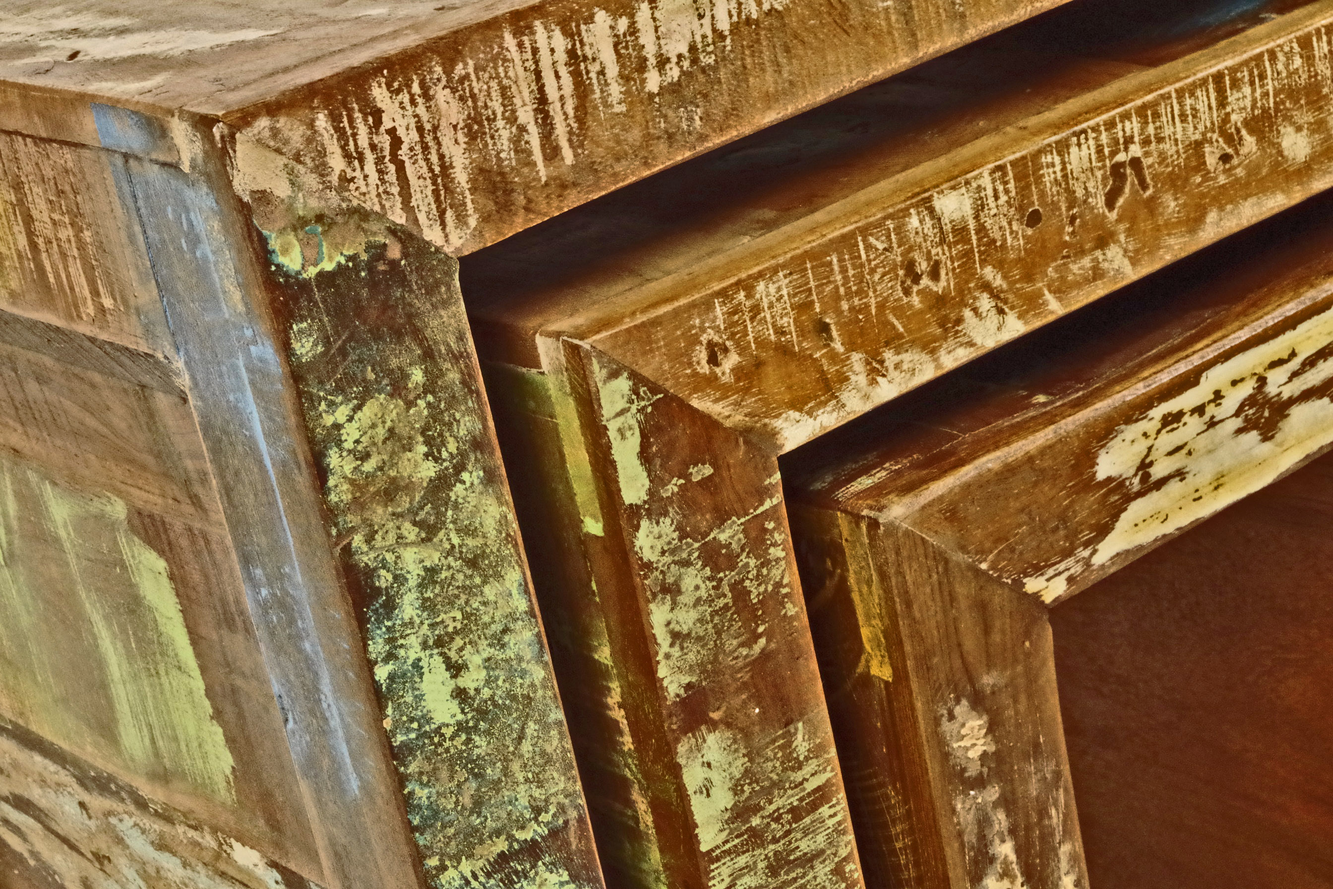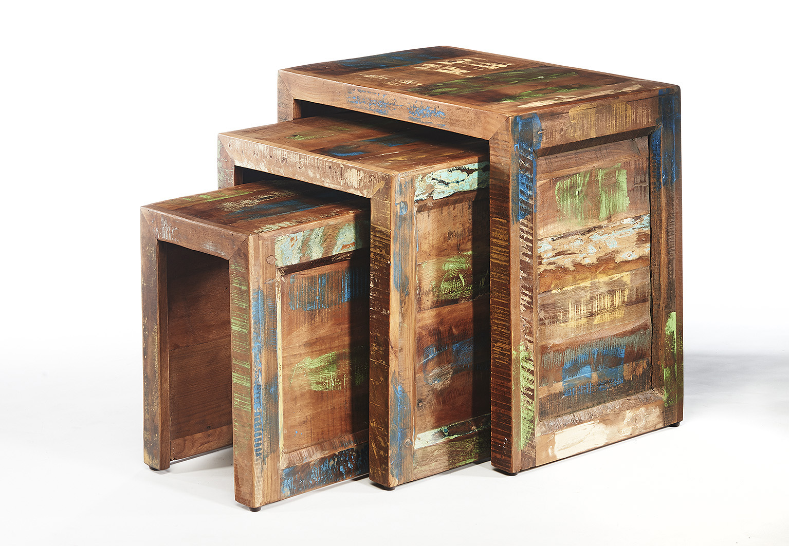 Originelles Beistelltisch-Set von Kobolo im Vintagedesign. Das Set besteht aus 3 Teilen und besticht durch seine Individualität. Die Beistelltische werden aus umweltfreundlich recyceltem Holz hergestellt. Sie sind vielseitig einsetzbar und verleihen ihrem Wohnraum das gewisse Etwas. Maße Ca.Gr1 28cm x 40cm x 45cm , Gr2 44cm x 40cm x 53cm , Gr3 60cm x 40cm x 62cm