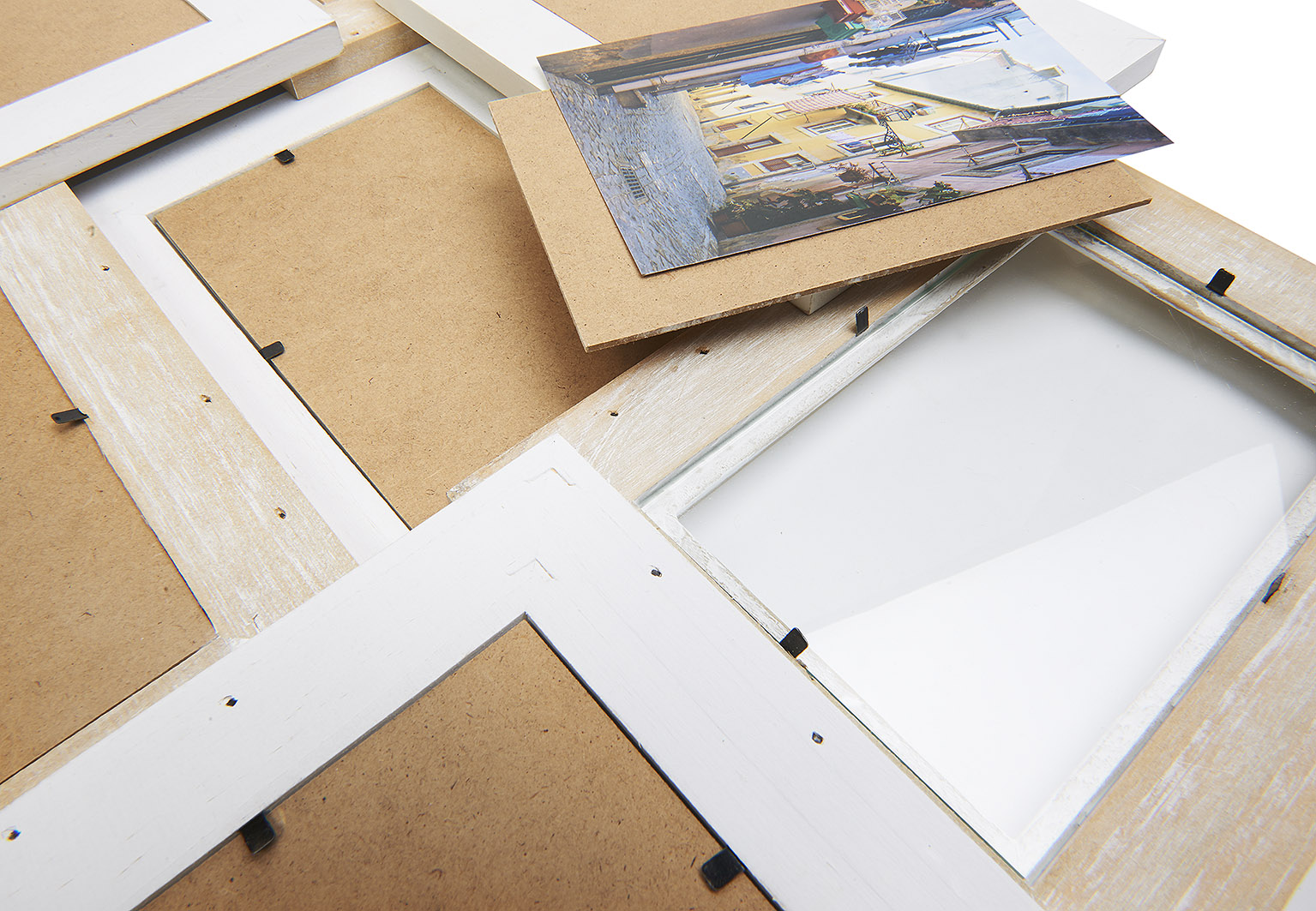 Wunderschöne Bilderrahmen-Collage mit platz für 7 Bilder. Der Bilderrahmen ist aus Holz gefertigt und im angesagten Vintage- bzw. Shabby-Stil gehalten. Die Naturtöne passen zu allen Einrichtungsstilen und zaubern ein modernes Ambiente in Ihr Zuhause. Mit praktischer Metallöse zum Aufhängen. Länge 49cm x Breite 4cm x Höhe 44cm