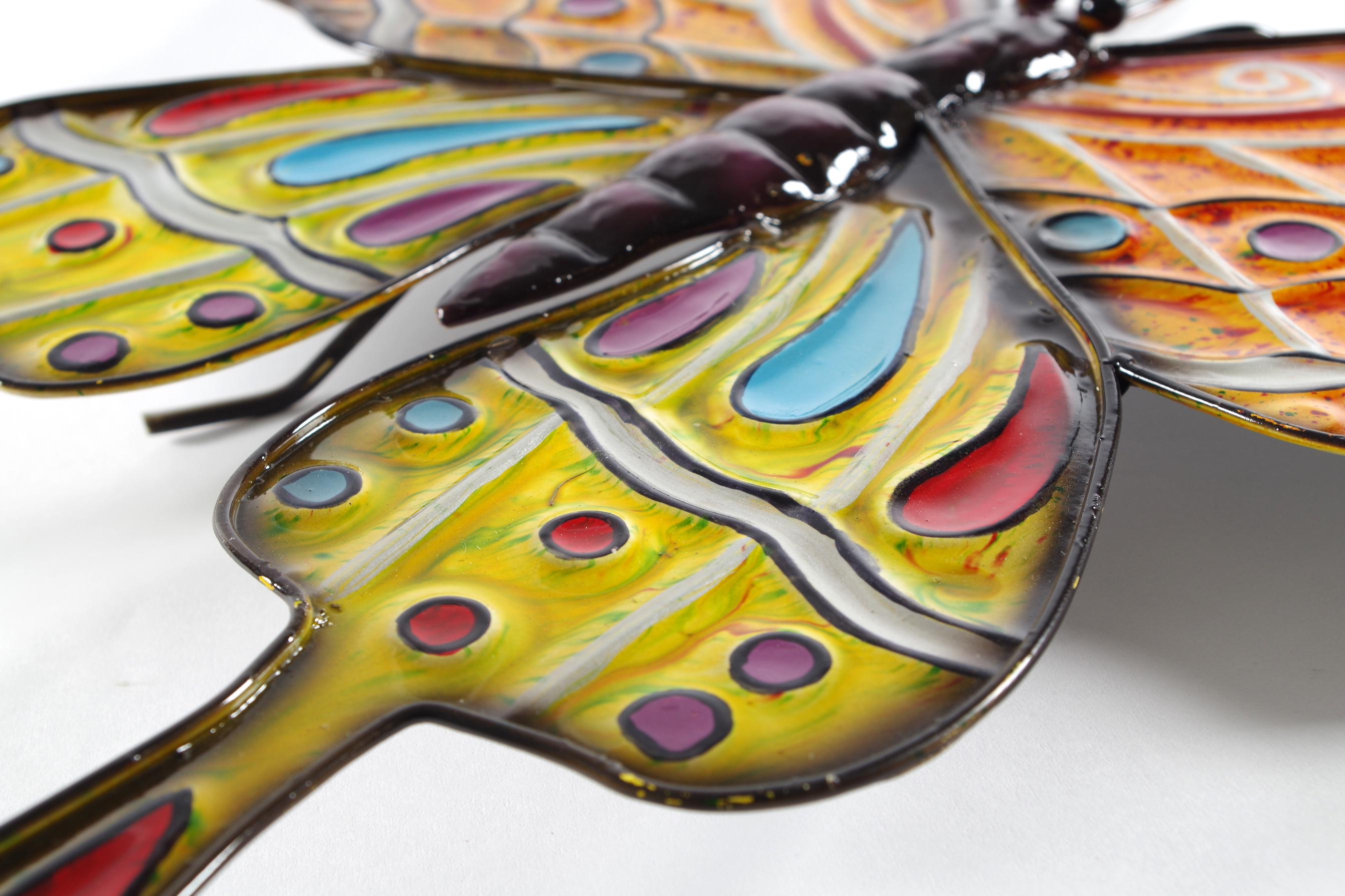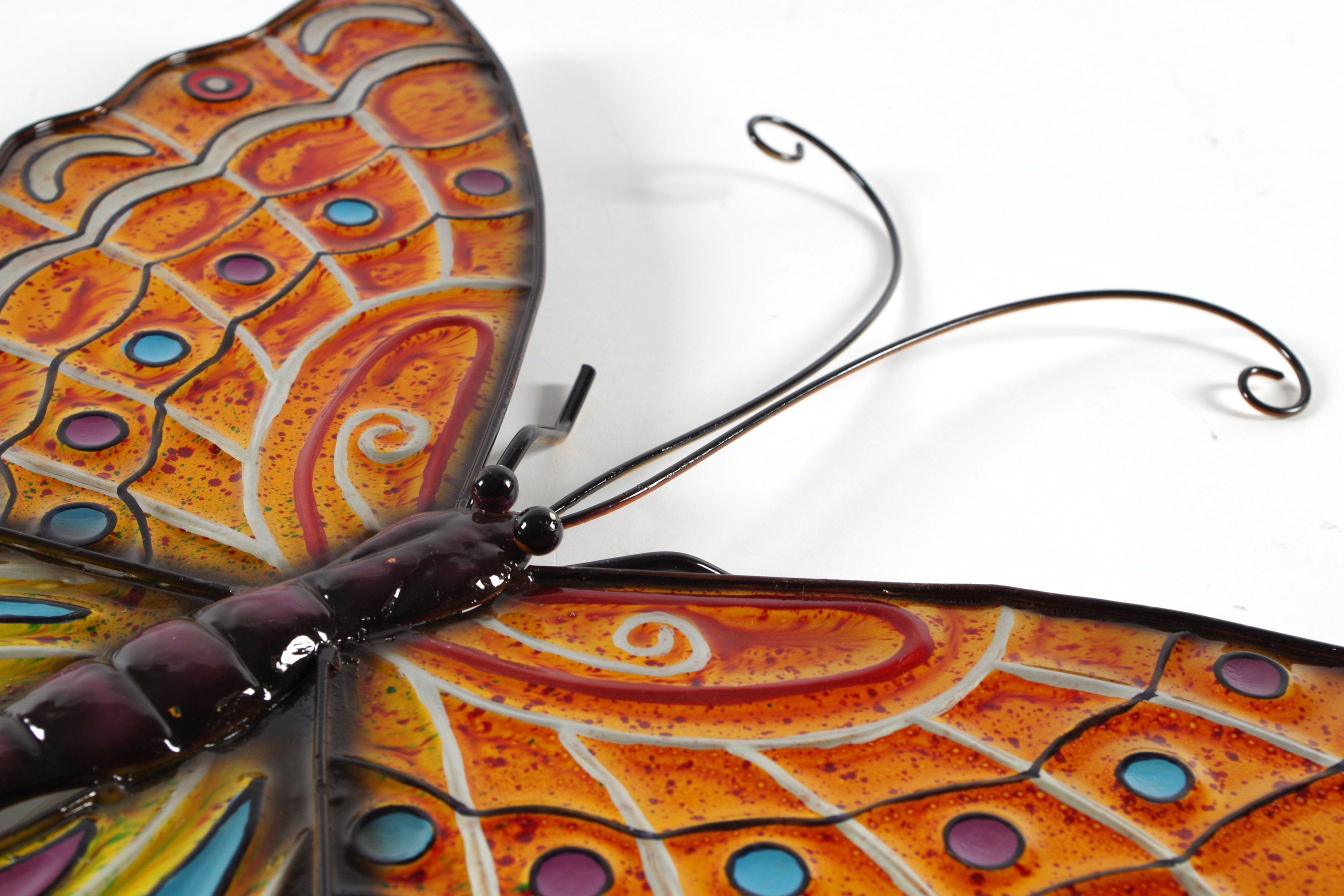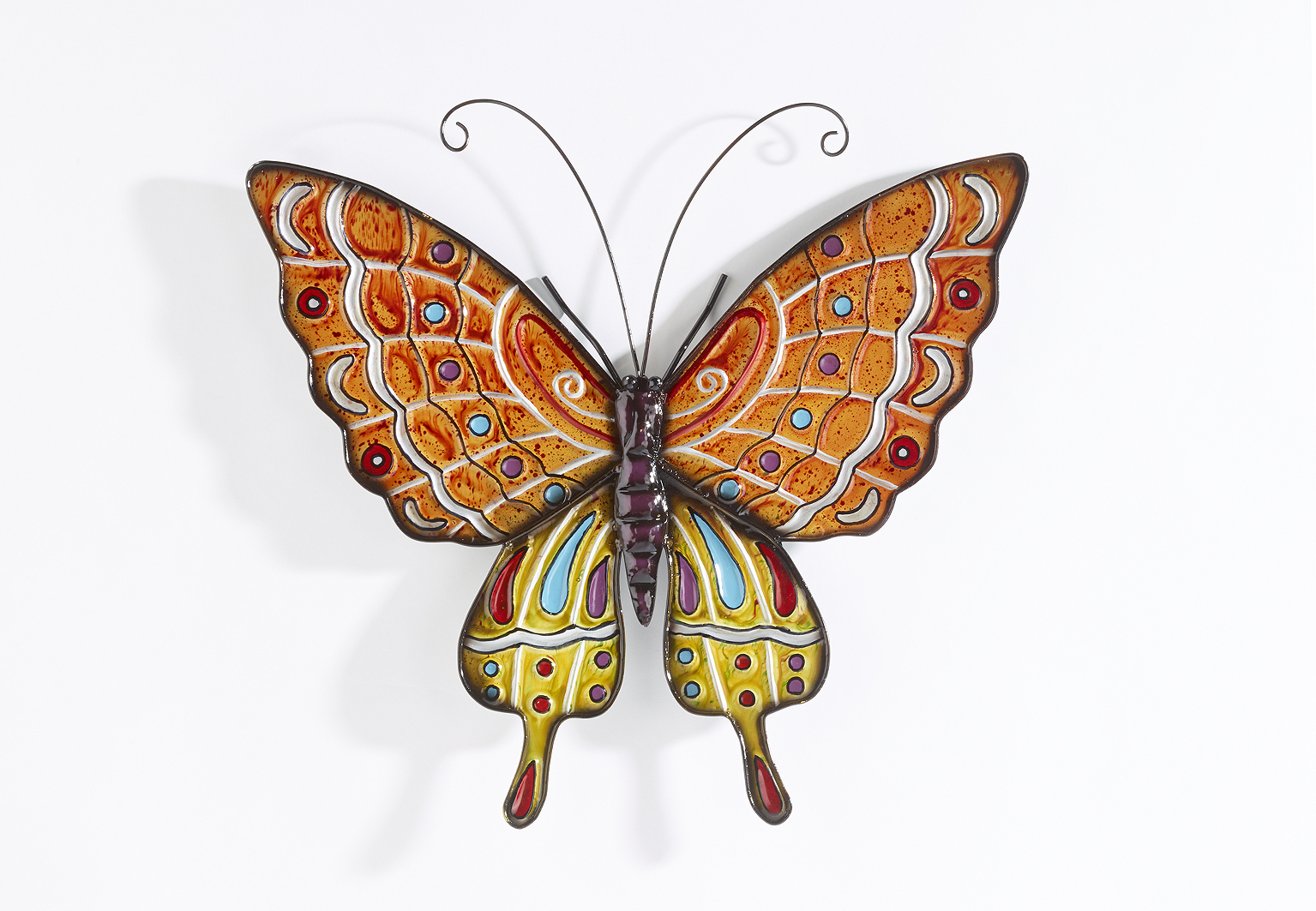 Wanddekoration "Schmetterling" aus Metall von Kobolo, lackiert in den Farben orange und grün, einfache, verdeckte Befestigungsmöglichkeit auf der Rückseite vorhanden. Länge 40cm x Breite 45cm x Höhe 3cm
