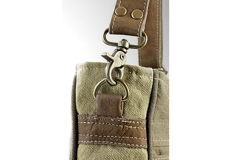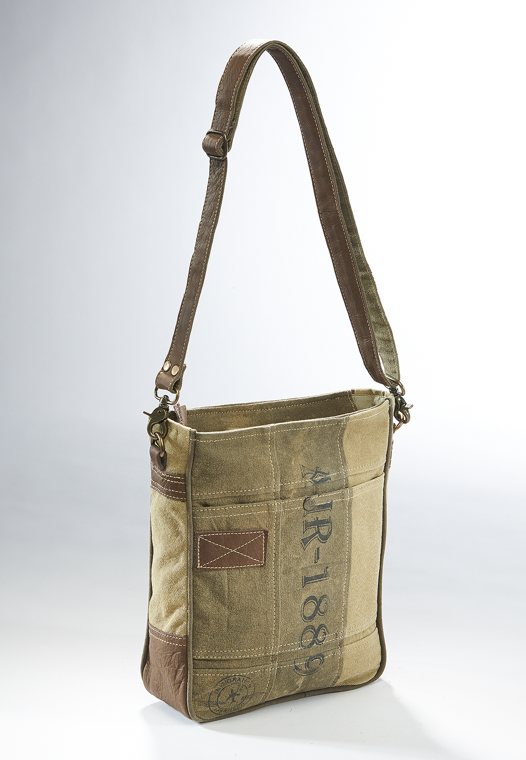 Angesagte Handtasche aus recycelten und neuen Materialien von Kobolo. Diese modische Tasche wurde aus unverwüstlichen, originalen Planen militärischer Zelte und Lastwagen in Kombination mit modernen Stoffen und Accessoires hergestellt, was ihren einzigartigen Vintage/Used-Look ausmacht. Jedes Stück einzeln gefertigt und für den Besitzer ein unverwechselbares Unikat. Haupt- und Rückfach mit Reißverschluss, Innen Einsteckfach. Länge 26cm x Breite 9cm x Höhe 34cm