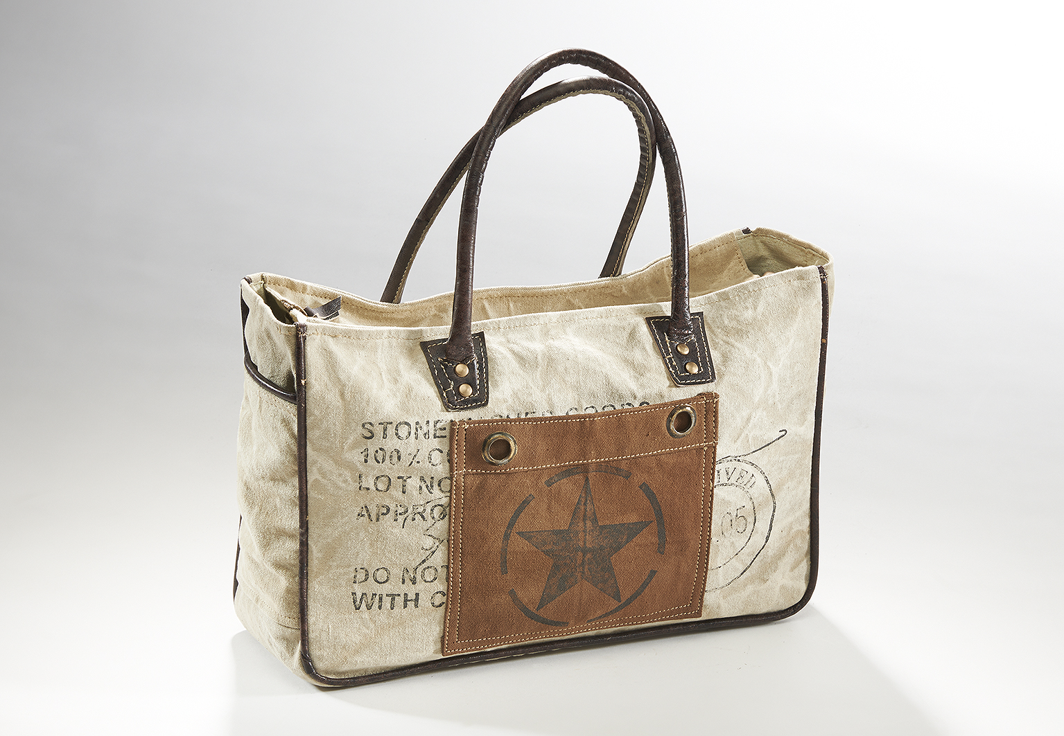Angesagte Handtasche aus recycelten und neuen Materialien von Kobolo. Diese modische Tasche wurde aus unverwüstlichen, originalen Planen militärischer Zelte und Lastwagen in Kombination mit modernen Stoffen und Accessoires hergestellt, was ihren einzigartigen Vintage/Used-Look ausmacht. Jedes Stück einzeln gefertigt und für den Besitzer ein unverwechselbares Unikat. Haupt- und Rückfach mit Reißverschluss, Innen Einsteckfach. Länge 40cm x Breite 12cm x Höhe 26cm