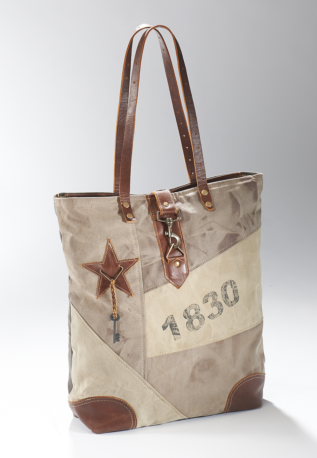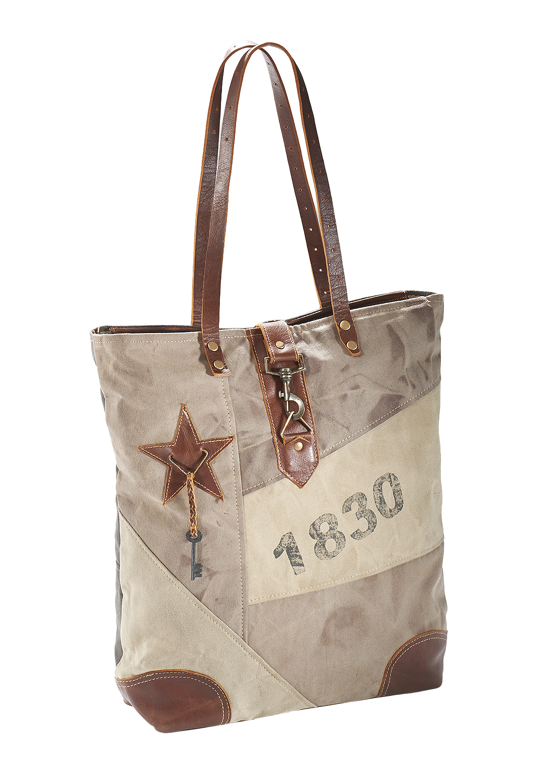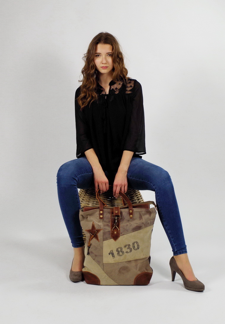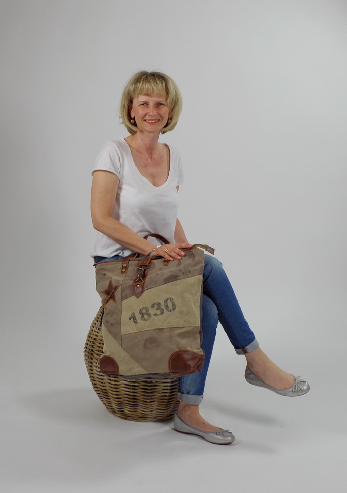 Modische Vintage Tasche aus recycelten und neuen Materialien von Kobolo. Diese modische Vintage Tasche wurde aus unverwüstlichen, originalen Planen militärischer Zelte und Lastwagen in Kombination mit modernen Stoffen und Accessoires hergestellt, was ihren einzigartigen Vintage/Used Look ausmacht. Jedes Stück einzeln gefertigt und für den Besitzer ein unverwechselbares Unikat. Haupt- und Rückfach mit Reißverschluss, Innen Einsteckfach. Länge 45cm x Breite 10cm x Höhe 45cm