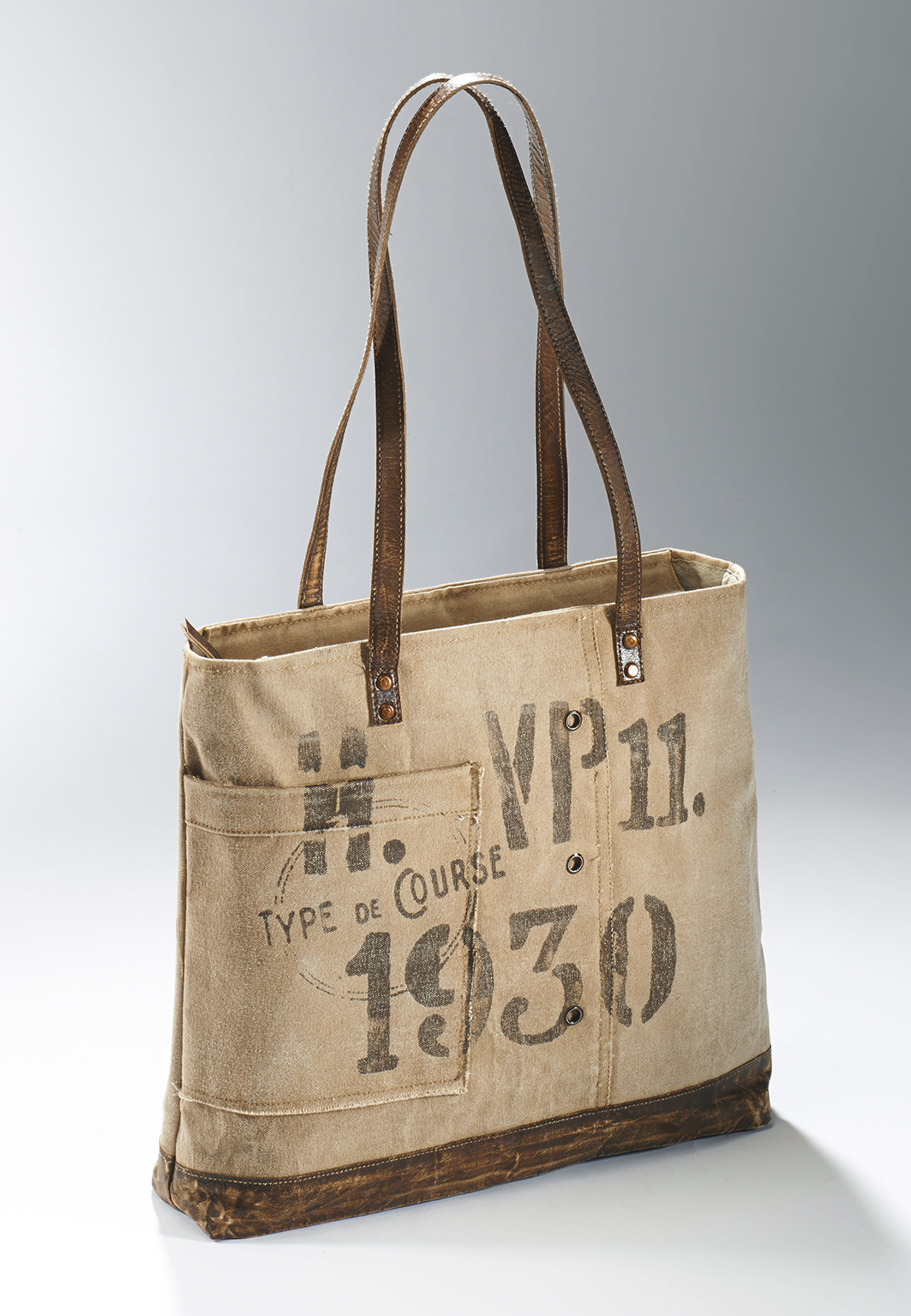 Modische Vintage Tasche aus recycelten und neuen Materialien von Kobolo. Diese modische Vintage Tasche wurde aus unverwüstlichen, originalen Planen militärischer Zelte und Lastwagen in Kombination mit modernen Stoffen und Accessoires hergestellt, was ihren einzigartigen Vintage/Used Look ausmacht. Jedes Stück einzeln gefertigt und für den Besitzer ein unverwechselbares Unikat. Haupt- und Rückfach mit Reißverschluss, Innen Einsteckfach. Länge 44cm x Breite 10cm x Höhe 36cm