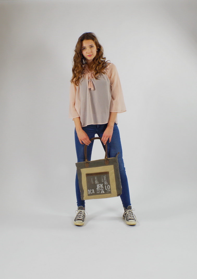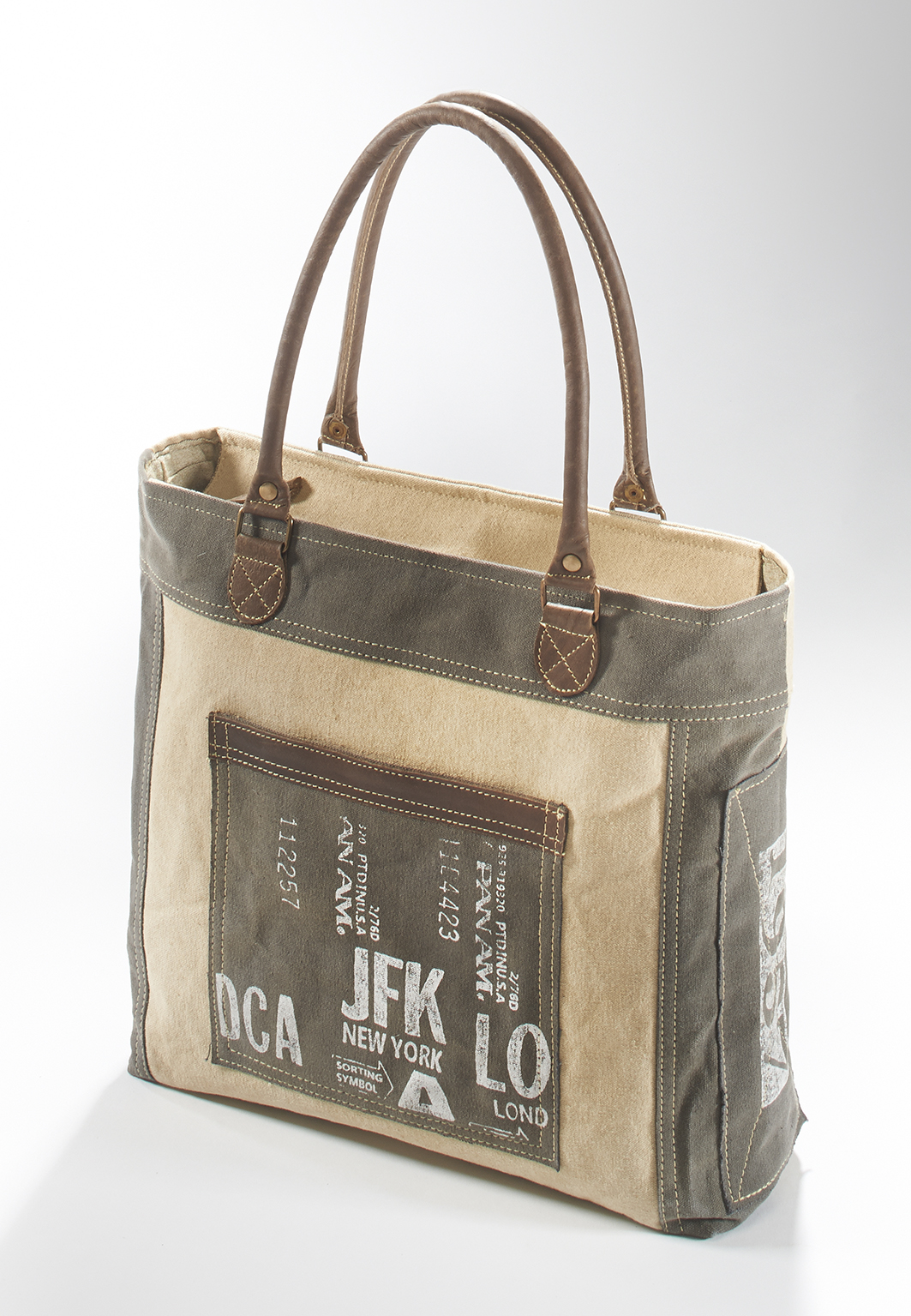 Modische Vintage Tasche aus recycelten und neuen Materialien von Kobolo. Diese modische Vintage Tasche wurde aus unverwüstlichen, originalen Planen militärischer Zelte und Lastwagen in Kombination mit modernen Stoffen und Accessoires hergestellt, was ihren einzigartigen Vintage/Used Look ausmacht. Jedes Stück einzeln gefertigt und für den Besitzer ein unverwechselbares Unikat. Haupt- und Rückfach mit Reißverschluss, Innen Einsteckfach. Länge 44cm x Breite 10cm x Höhe 36cm