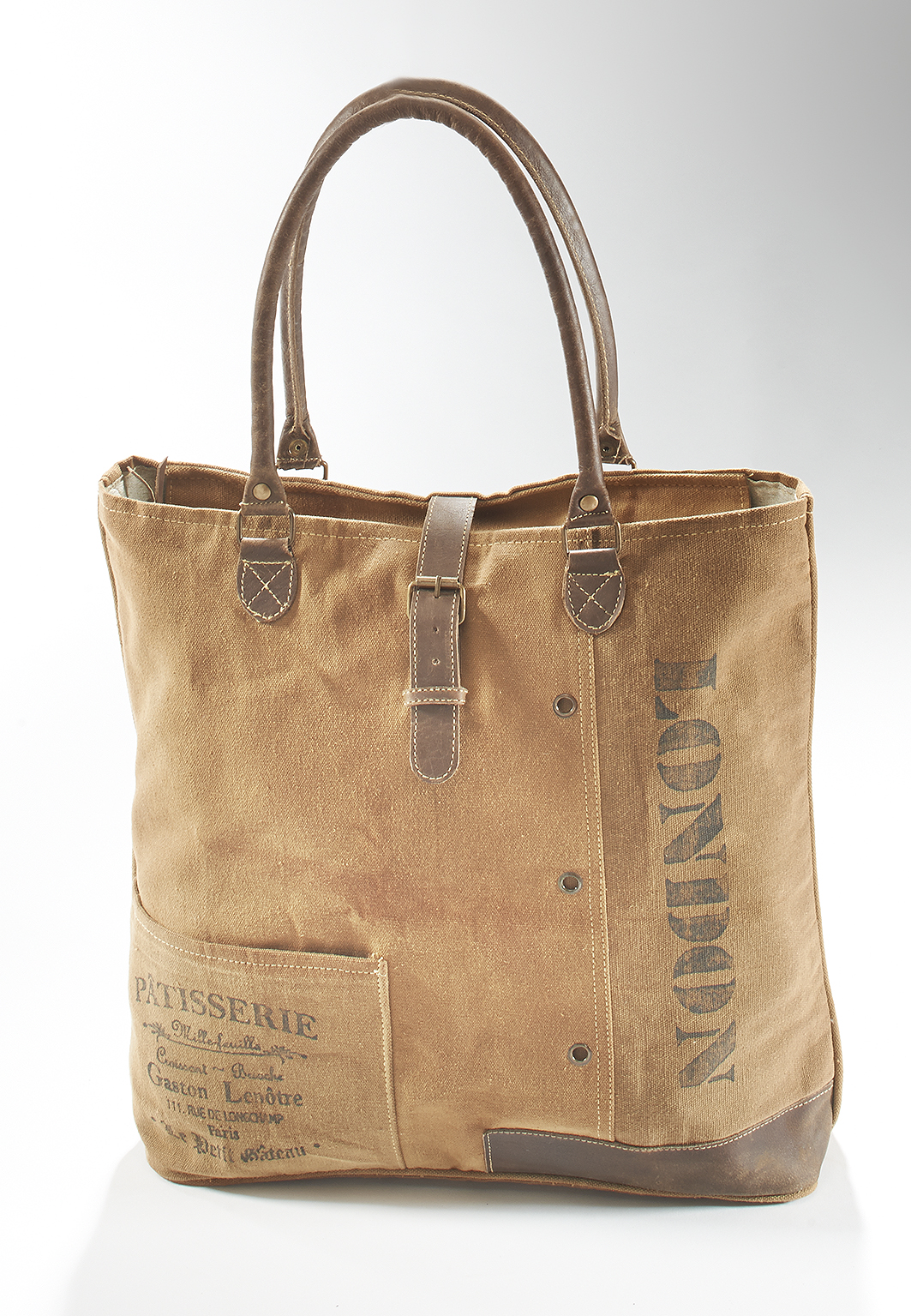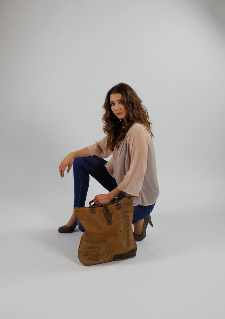 Modische Vintage Tasche aus recycelten und neuen Materialien von Kobolo. Diese modische Vintage Tasche wurde aus unverwüstlichen, originalen Planen militärischer Zelte und Lastwagen in Kombination mit modernen Stoffen und Accessoires hergestellt, was ihren einzigartigen Vintage/Used Look ausmacht. Jedes Stück einzeln gefertigt und für den Besitzer ein unverwechselbares Unikat. Haupt- und Rückfach mit Reißverschluss, Innen Einsteckfach. Länge 44cm x Breite 10cm x Höhe 40cm