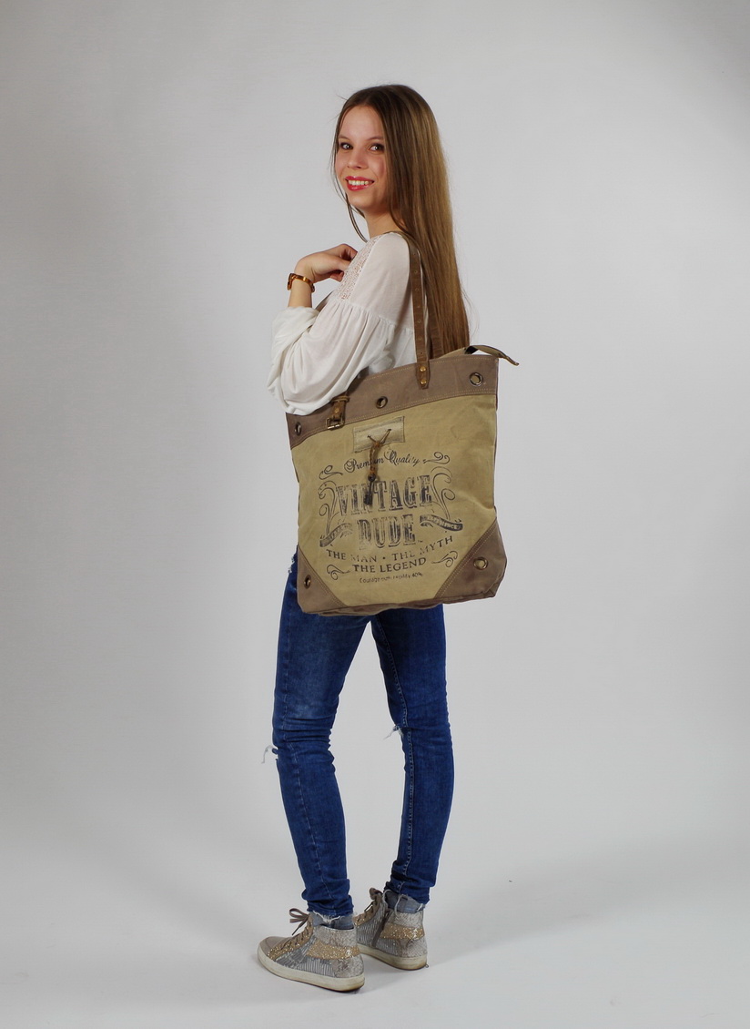 Modische Vintage Tasche aus recycelten und neuen Materialien von Kobolo. Diese modische Vintage Tasche wurde aus unverwüstlichen, originalen Planen militärischer Zelte und Lastwagen in Kombination mit modernen Stoffen und Accessoires hergestellt, was ihren einzigartigen Vintage/Used Look ausmacht. Jedes Stück einzeln gefertigt und für den Besitzer ein unverwechselbares Unikat. Haupt- und Rückfach mit Reißverschluss, Innen Einsteckfach. Länge 41cm x Breite 9cm x Höhe 42cm