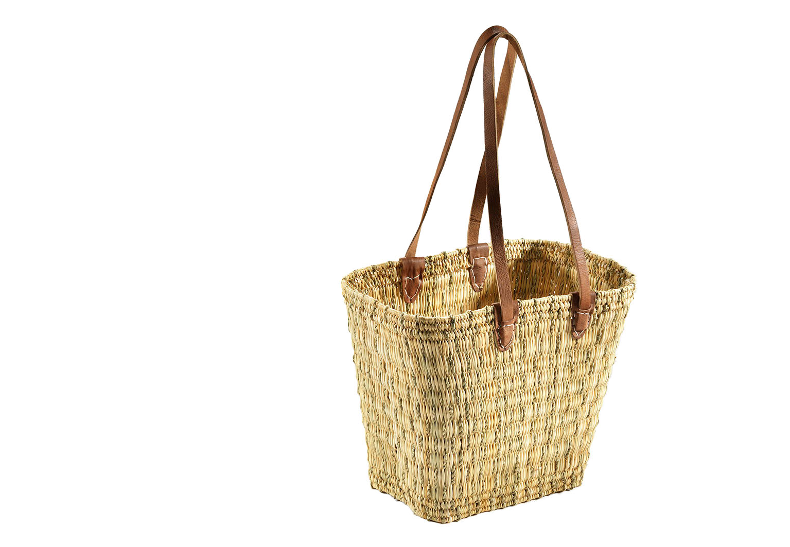 Seegrastasche aus Nordafrika von Kobolo. In Handarbeit aus Seegras hergestellt, mit edlen und handschmeichelnden Echtlederhenkeln versehen. Als klassischer Shopper oder auch vielseitig als Tasche verwendbar. Länge 42cm x Breite 20cm x Höhe 31cm