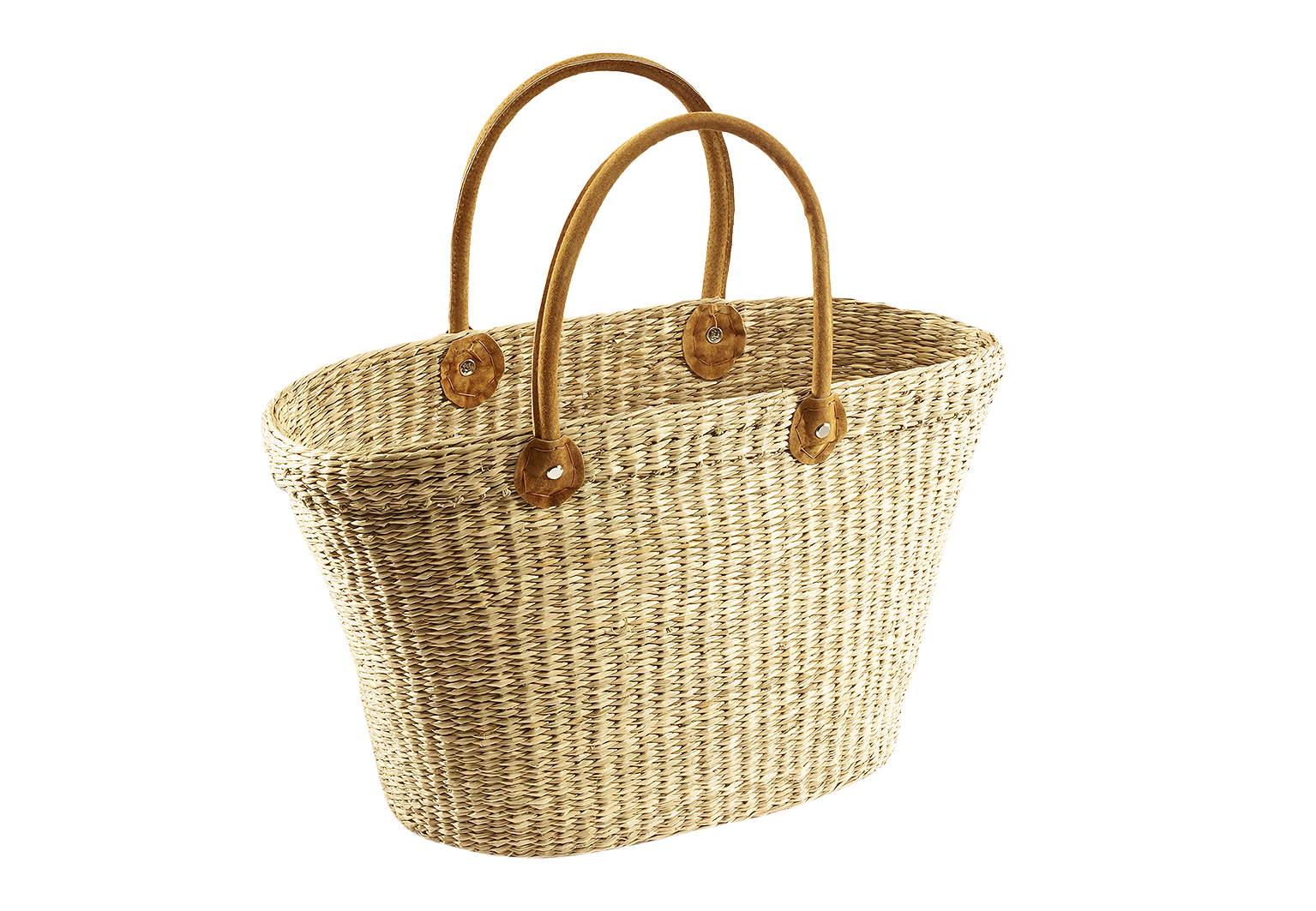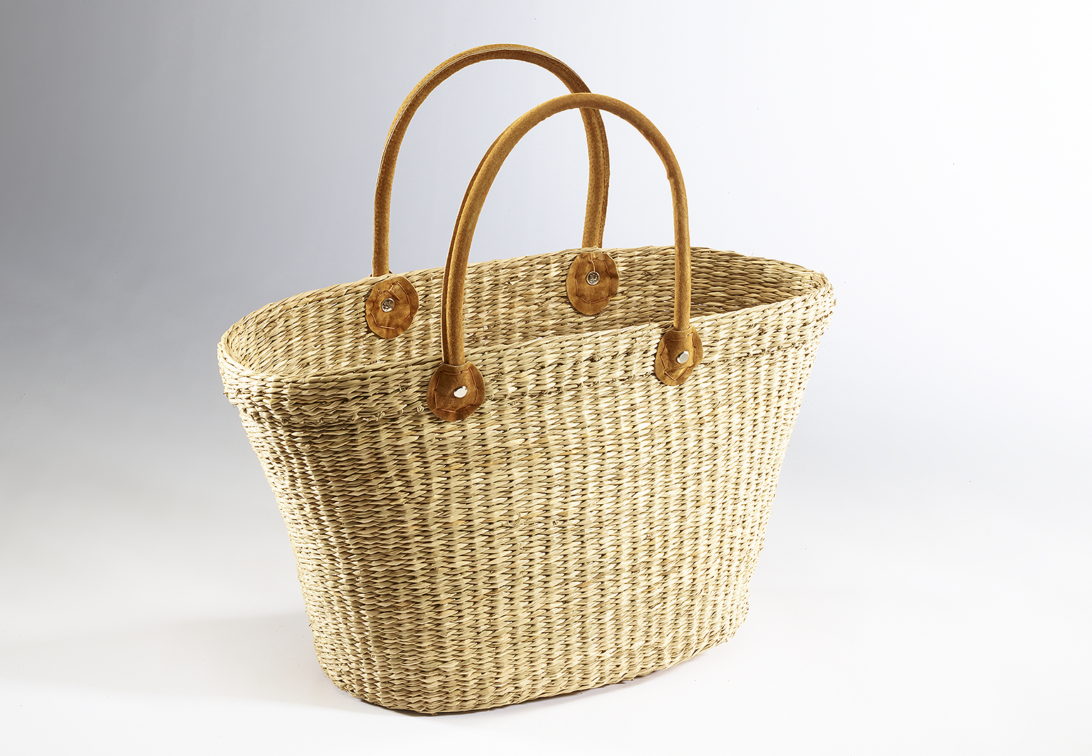Diese aus Seegras handgeflochtene Tasche von Kobolo ist Ihr idealer Einkaufsbegleiter.Sie besitzt kurze Echt-Lederhenkel und eignet sich auch hervorragend als Strandtasche. Länge 46cm x Breite 22cm x Höhe 28cm