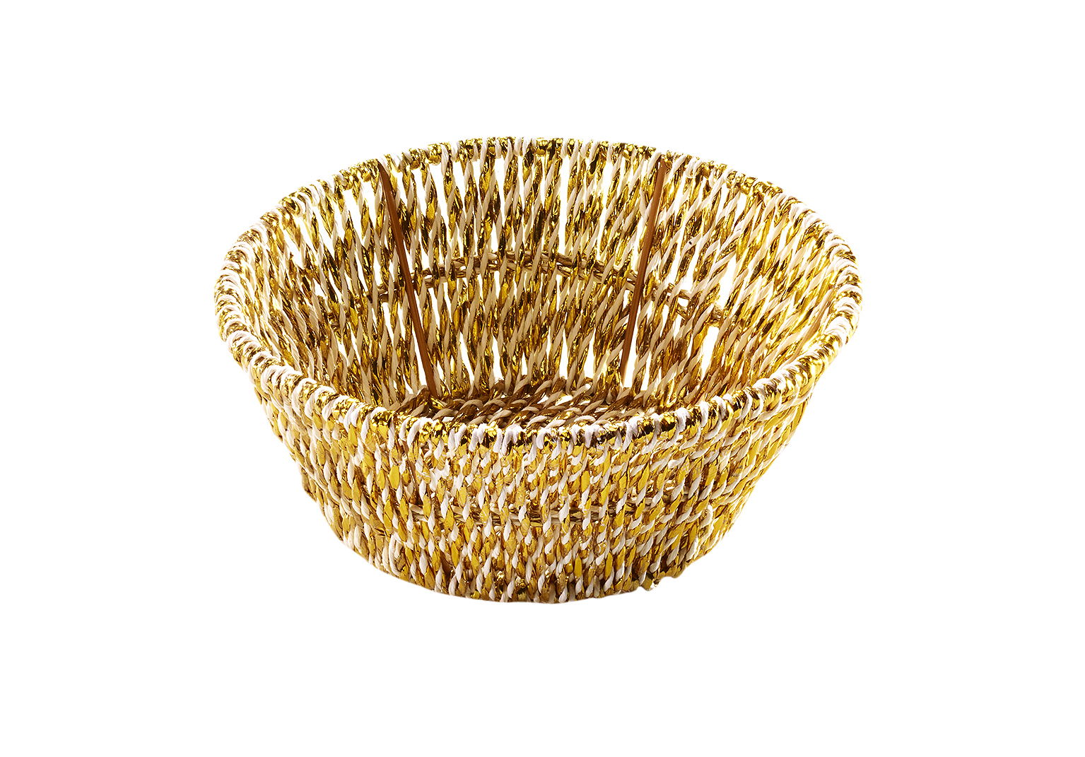 Die runde Dekoschale von Kobolo ist aus feinem Foliengeflecht gefertigt, das von einem Metallgerüst getragen wird. In festlichem Gold und Weiß gehalten, ist die Folienschale sowohl als Dekoration, als auch als Geschenk bestens geeignet.Durchmesser 18cm x Höhe 7cm