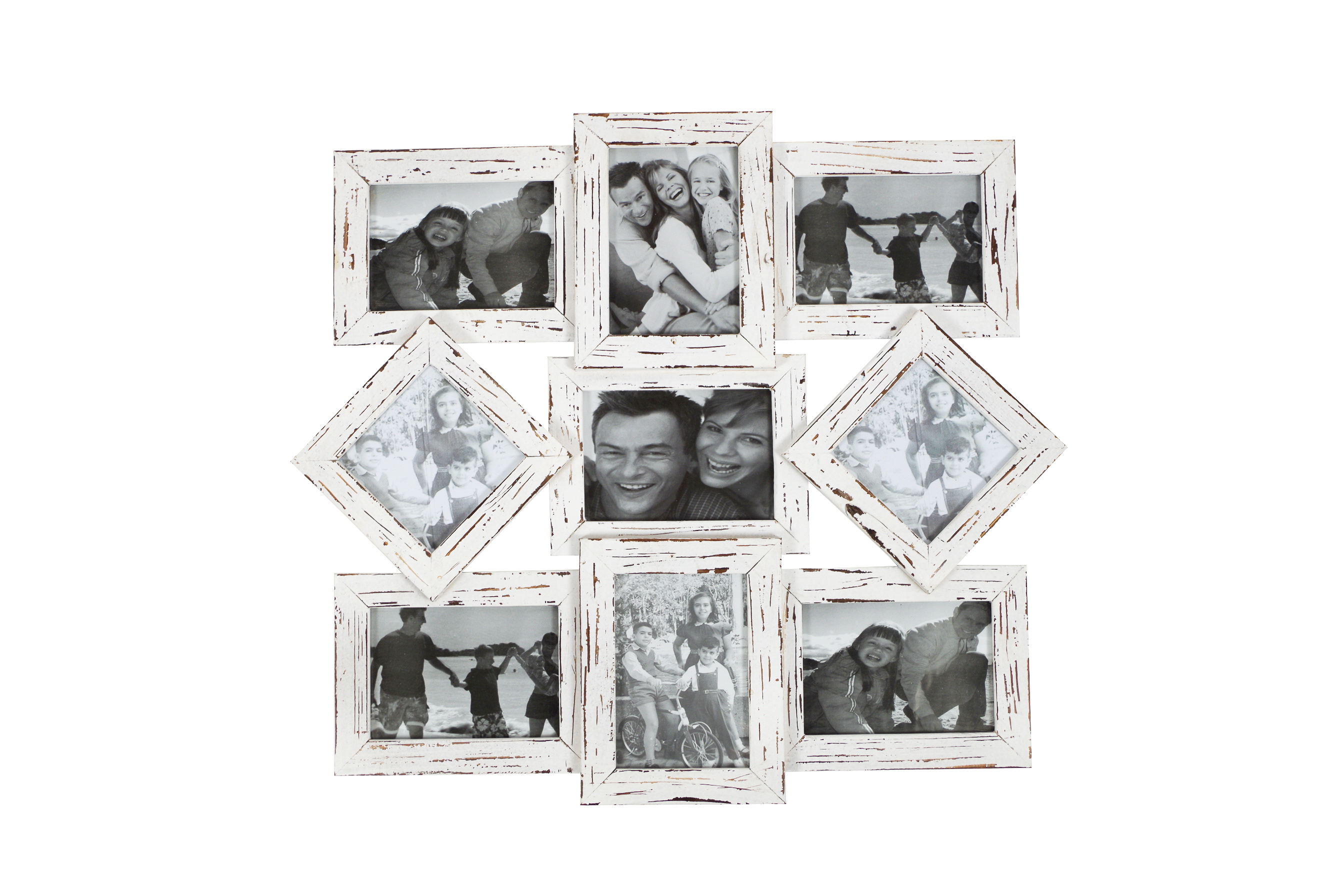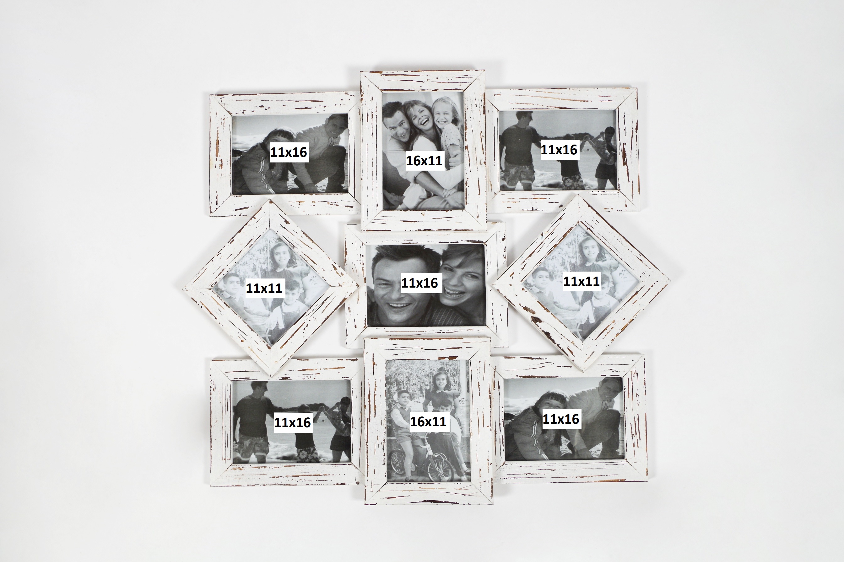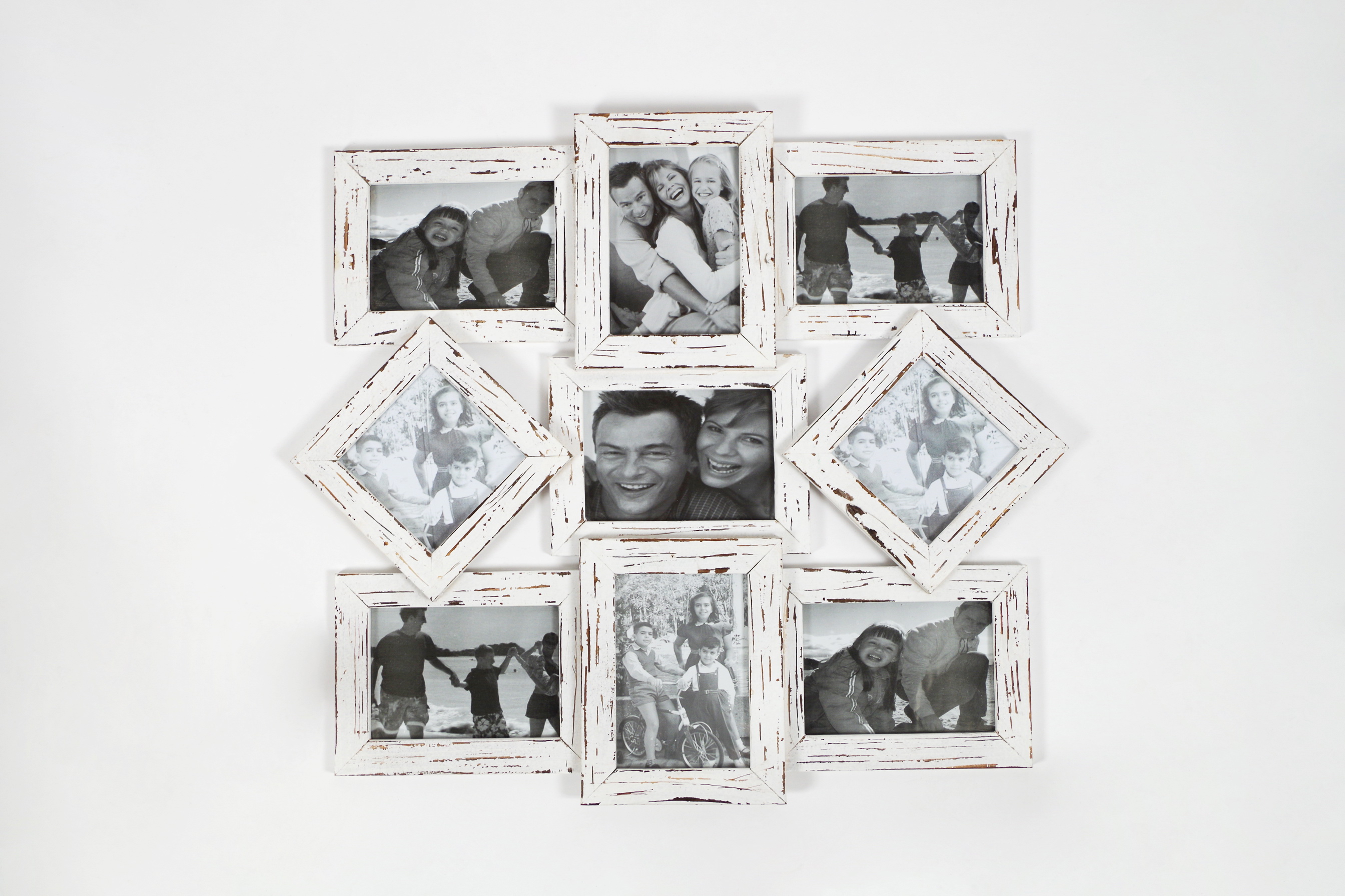 Wunderschöne Bilderrahmen-Collage aus Holz im Vintage-Stil von Kobolo. Die Collage bietet Platz für bis zu neun Bilder. Die Farbe Weiß passt zu allen Einrichtungsstilen und zaubert ein modernes Ambiente in Ihr Zuhause. Länge 65cm x Breite 3cm x Höhe 58cm