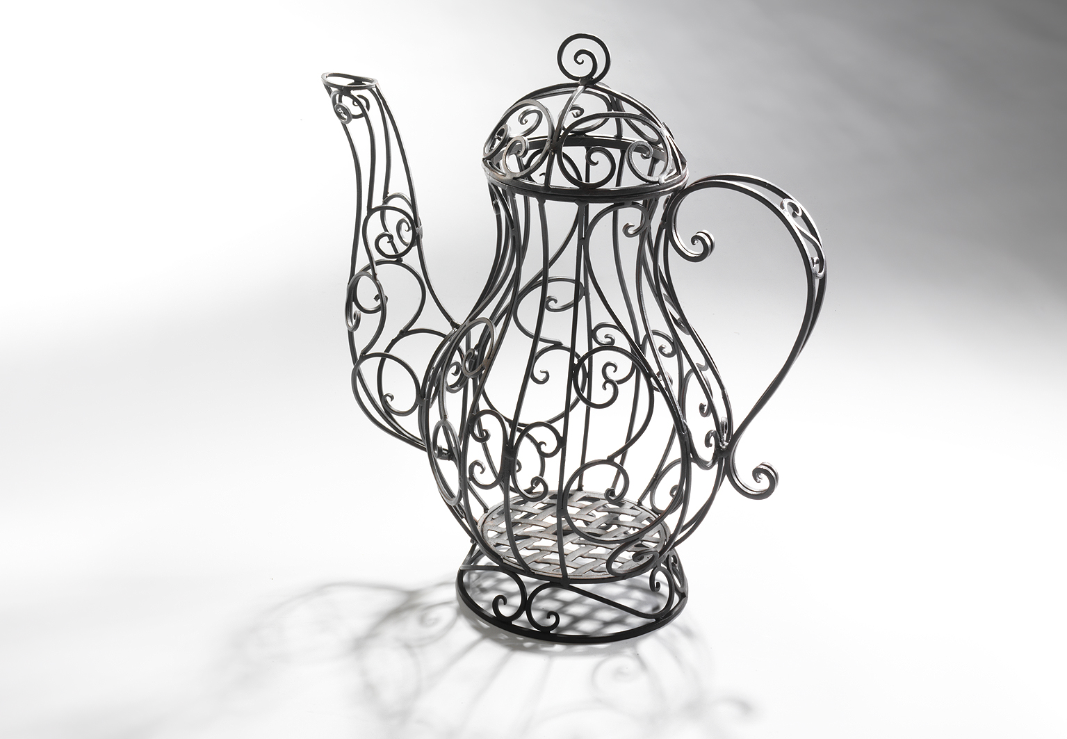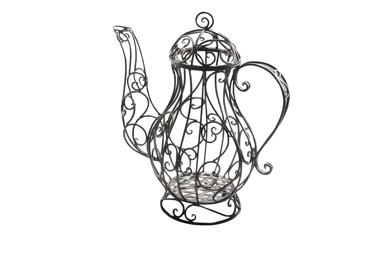 Alice im Wunderland lässt grüßen. Laden sie zum Kaffee und überraschen sie ihre Gäste mit dieser ausgefallenen Kaffeekanne zum Bepflanzen. Aufgrund des nostalgischen Musters erscheint diese Kanne aus Metall herrlich verspielt.Die aus schwarzem Draht, in schönen Rundungen, gestaltete Deko-Kanne, kann mit getrockneten, sowie frischem Grünzeug oder mit schönen Gestecken ausgeschmückt werden. Länge 34cm x Breite 19cm x Höhe 36cm
