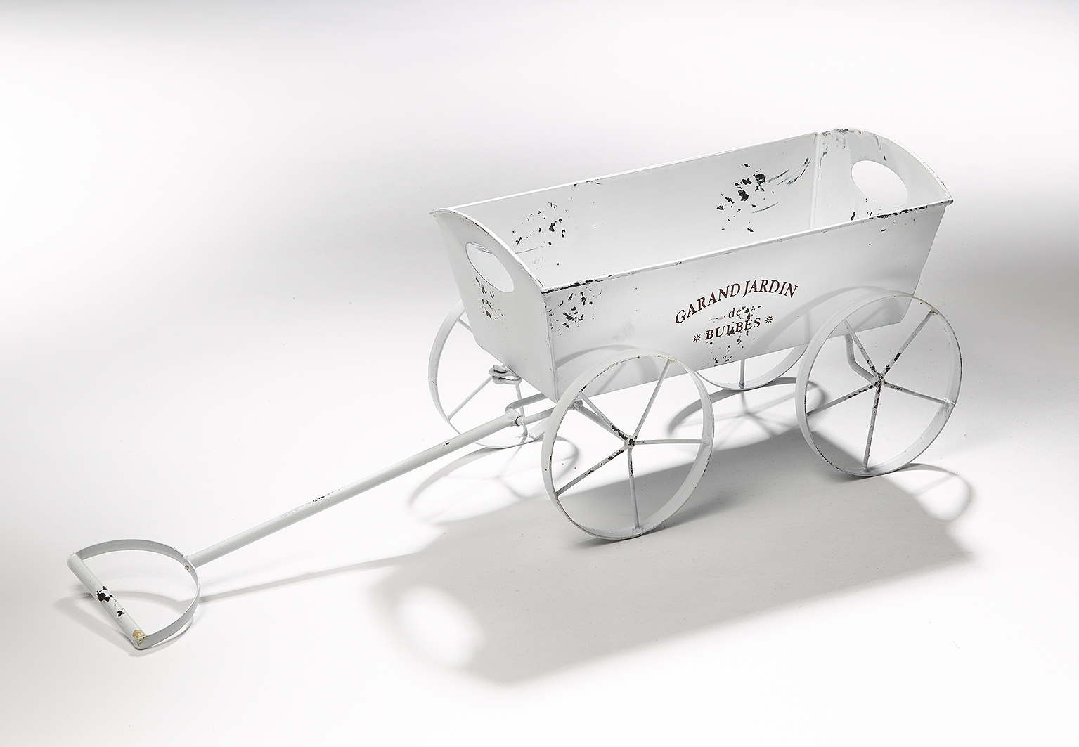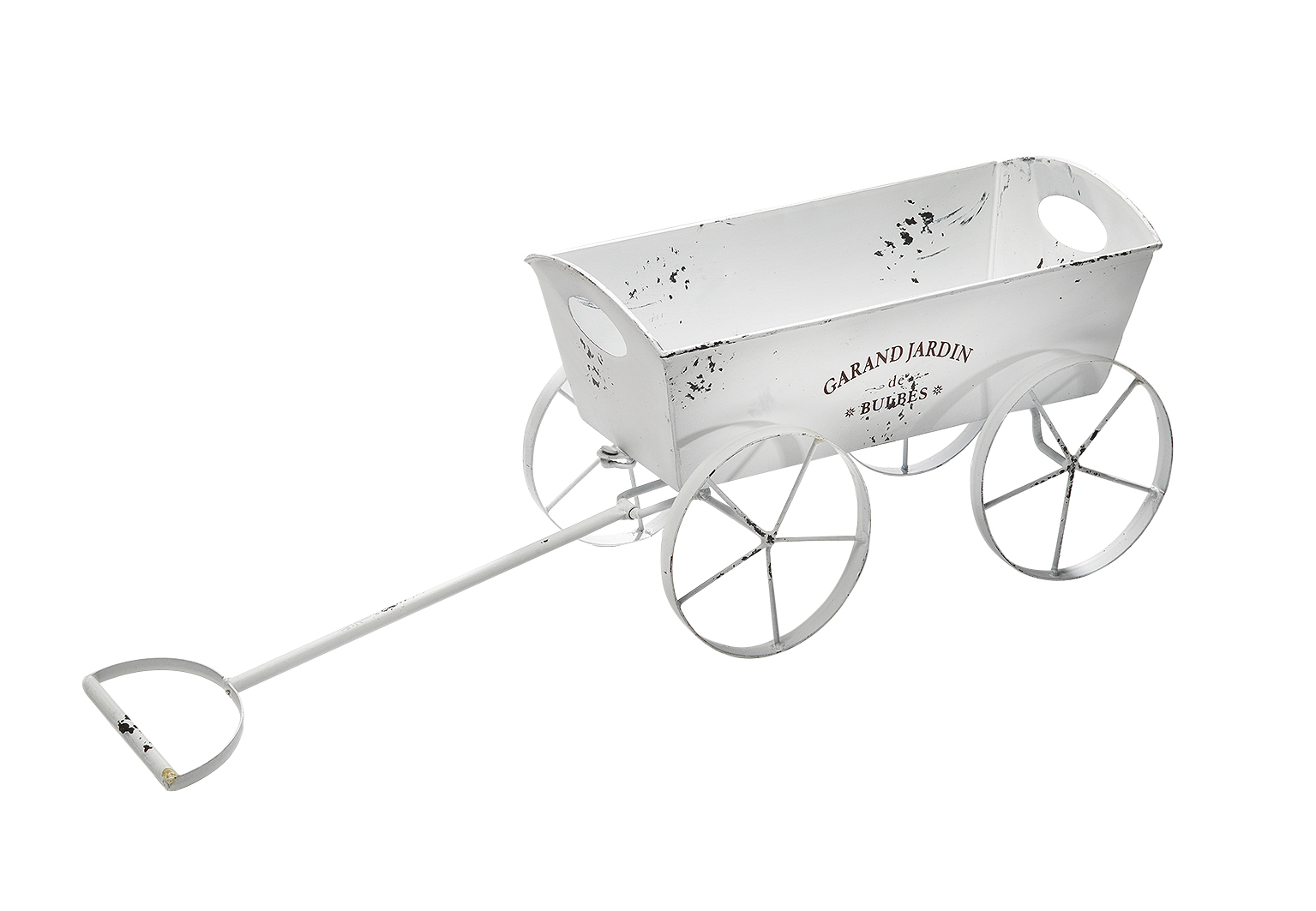 Raffiniertes Pflanzgefäß in Form eines kleinen Leiterwagens von Kobolo. Aus stabilem, weiß lackiertem Metall. Ein Blickfang für Haus und Garten. Maß für Pflanzteil: ca. 22/30cm Länge 59cm x Breite 18cm x Höhe 19cm