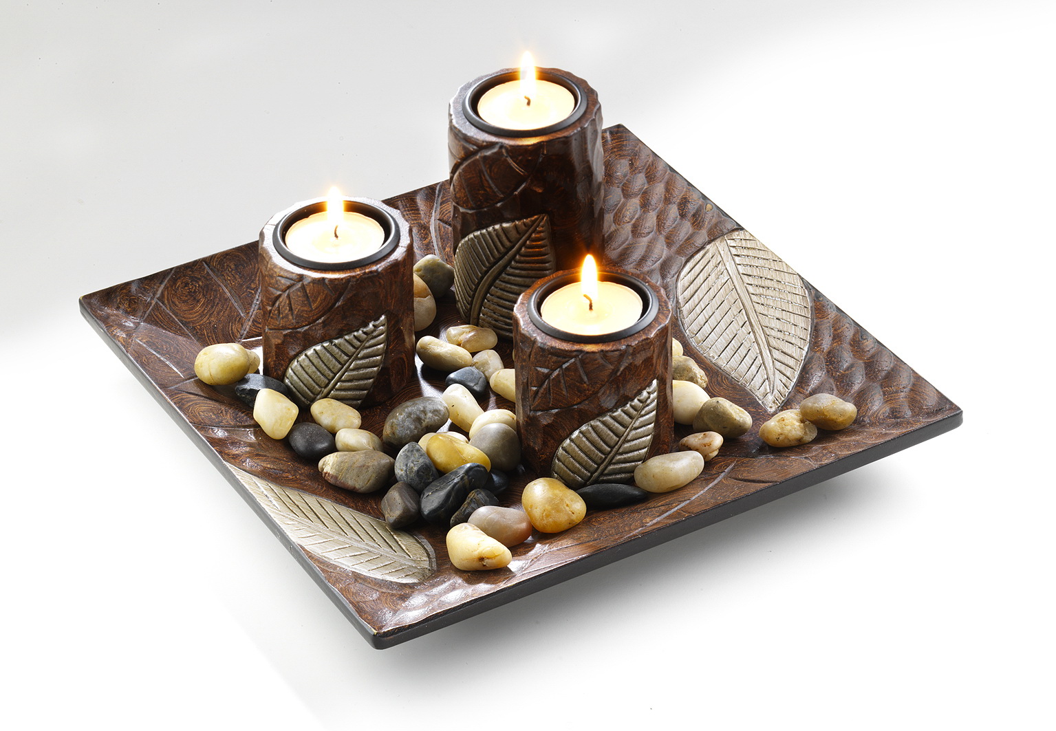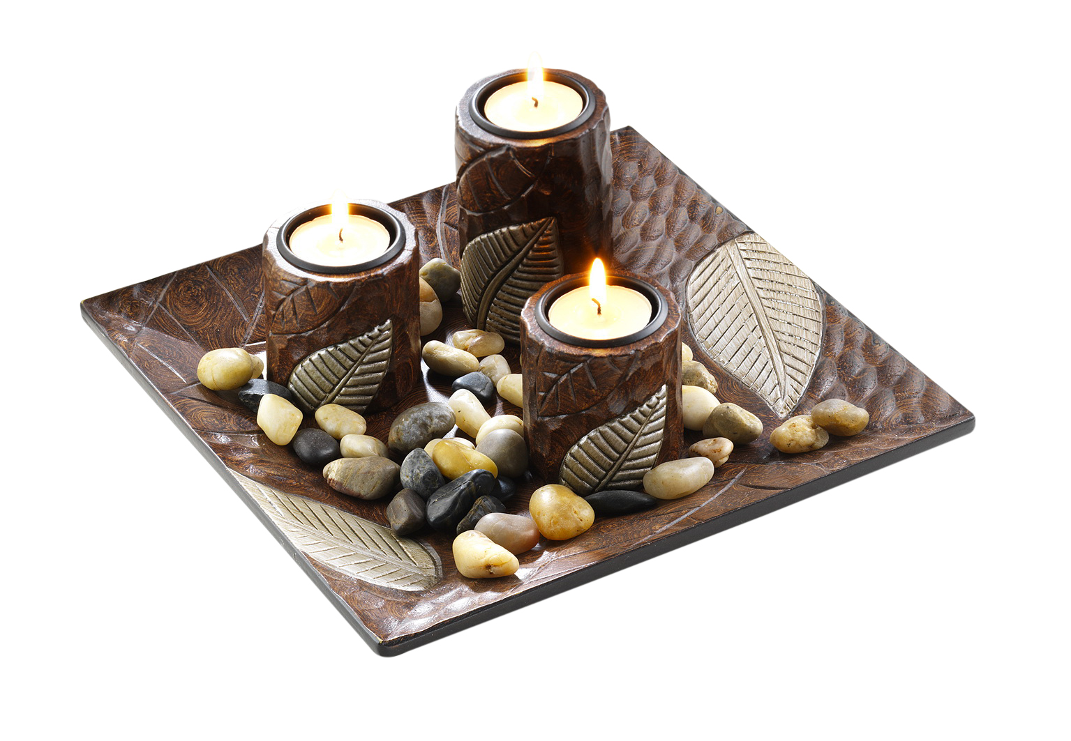 Dieses wunderschöne und aufwendig dekorierte Komplettset ist garantiert ein Blickfang in Ihrem Haus und rundet Ihre Einrichtung perfekt ab. Das Set von Kobolo besteht aus einem Dekoteller, 3 Kerzenhaltern und den dazugehörenden Dekosteinen. Länge 20cm x Breite 20cm x Höhe 10cm