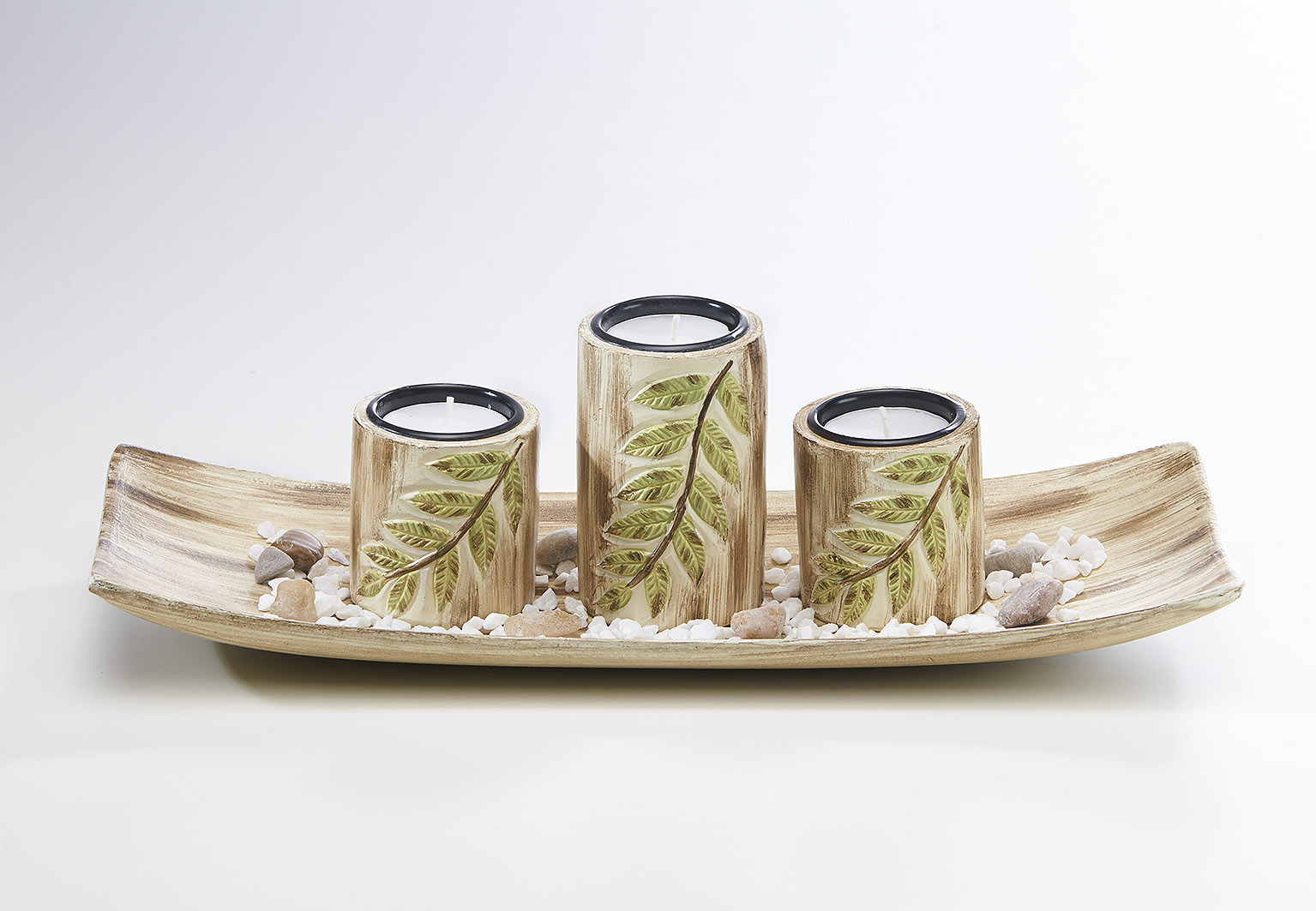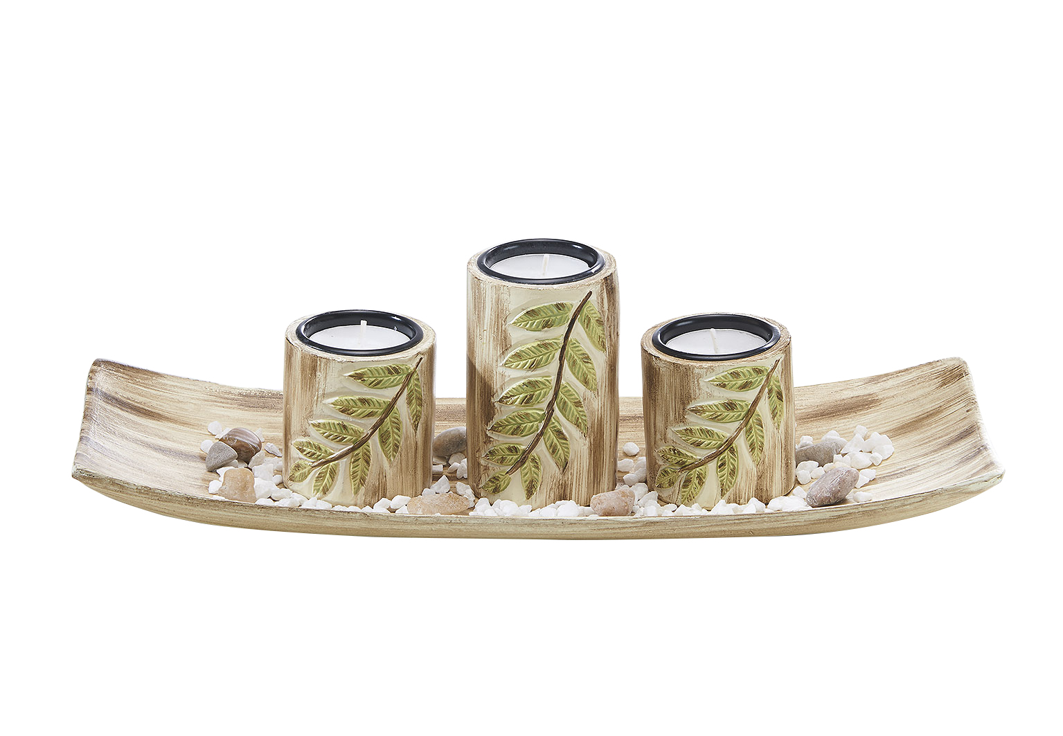 Dieses wunderschöne und aufwendig dekorierte Komplettset ist garantiert ein Blickfang in Ihrem Haus und rundet Ihre Einrichtung perfekt ab. Das Set von Kobolo besteht aus einem Dekoteller, drei Kerzenhaltern im Blattdesign und den dazugehörigen Dekosteine Länge 34cm x Breite 13cm x Höhe 10cm