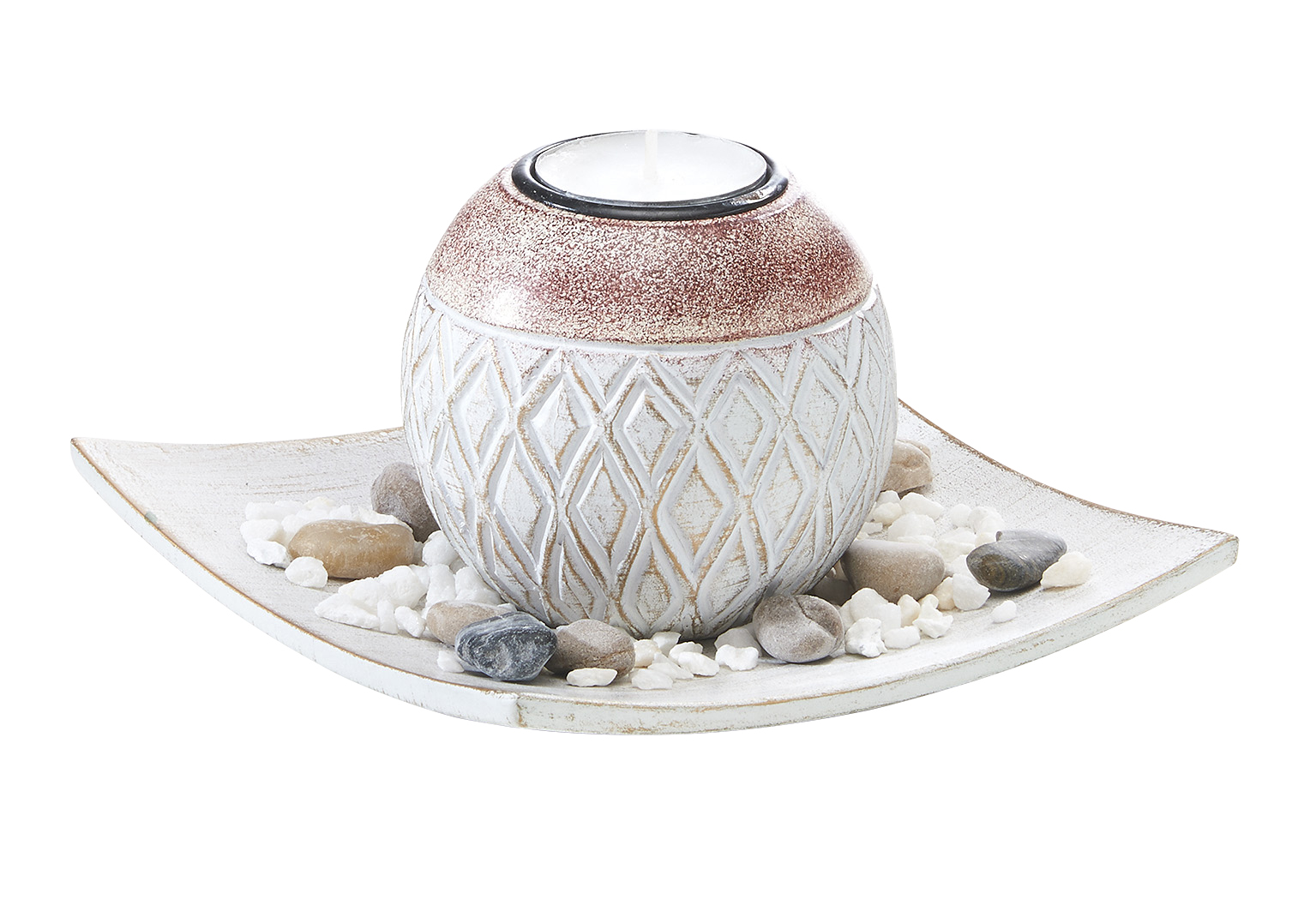 Dieses wunderschöne und aufwendig dekorierte Komplettset ist garantiert ein Blickfang in Ihrem Haus und rundet Ihre Einrichtung perfekt ab. Das Set von Kobolo besteht aus einem Dekoteller, einem Kerzenhalter und den dazugehörenden Dekosteinen. Länge 15cm x Breite 15cm x Höhe 8cm