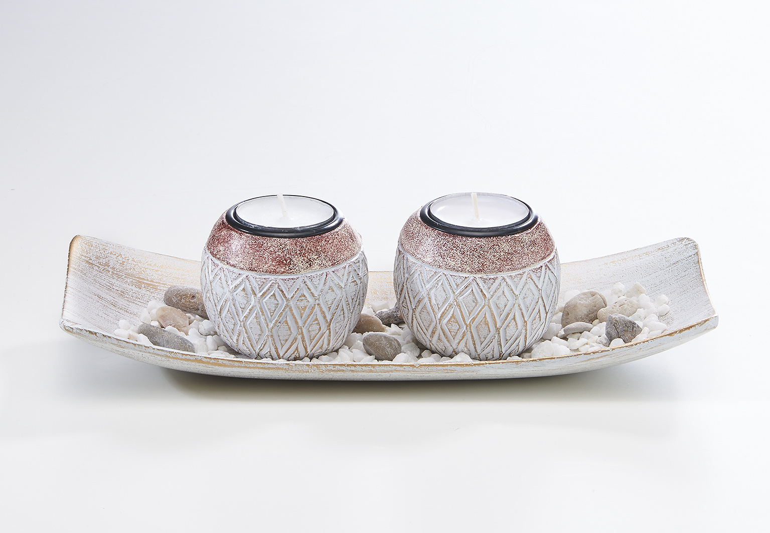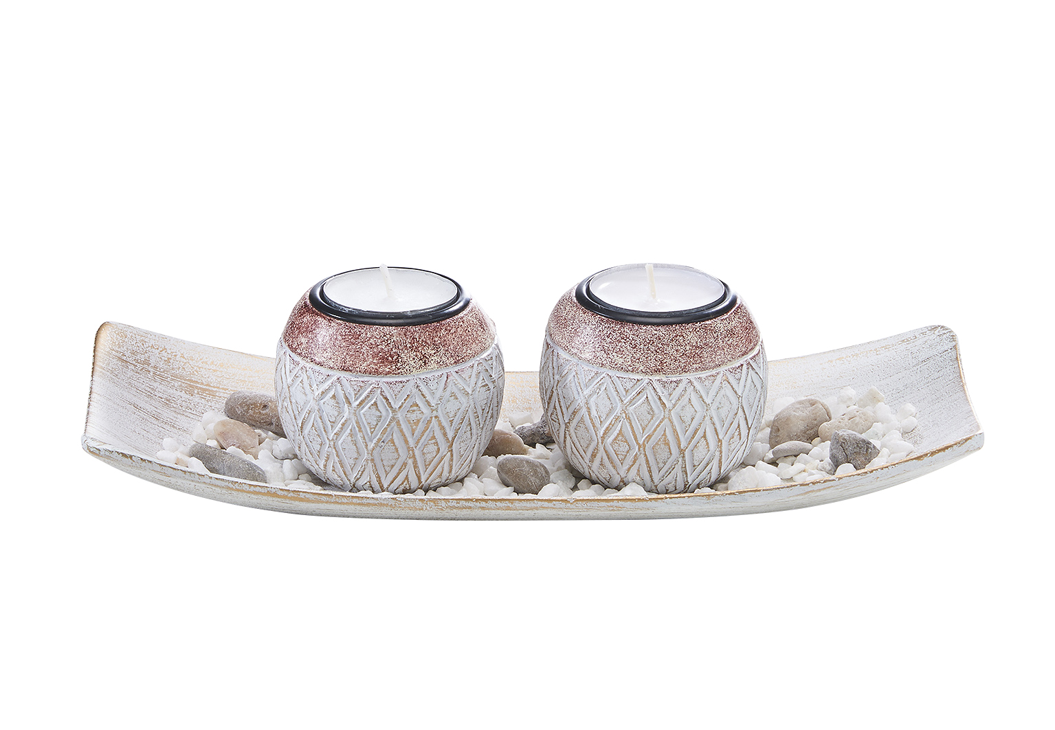 Dieses wunderschöne und aufwendig dekorierte Komplettset ist garantiert ein Blickfang in Ihrem Zuhause und rundet Ihre Einrichtung perfekt ab. Das Set von Kobolo besteht aus einem Dekoteller, zwei Kerzenhaltern und den dazugehörenden Dekosteinen. Länge 26cm x Breite 10cm x Höhe 6cm
