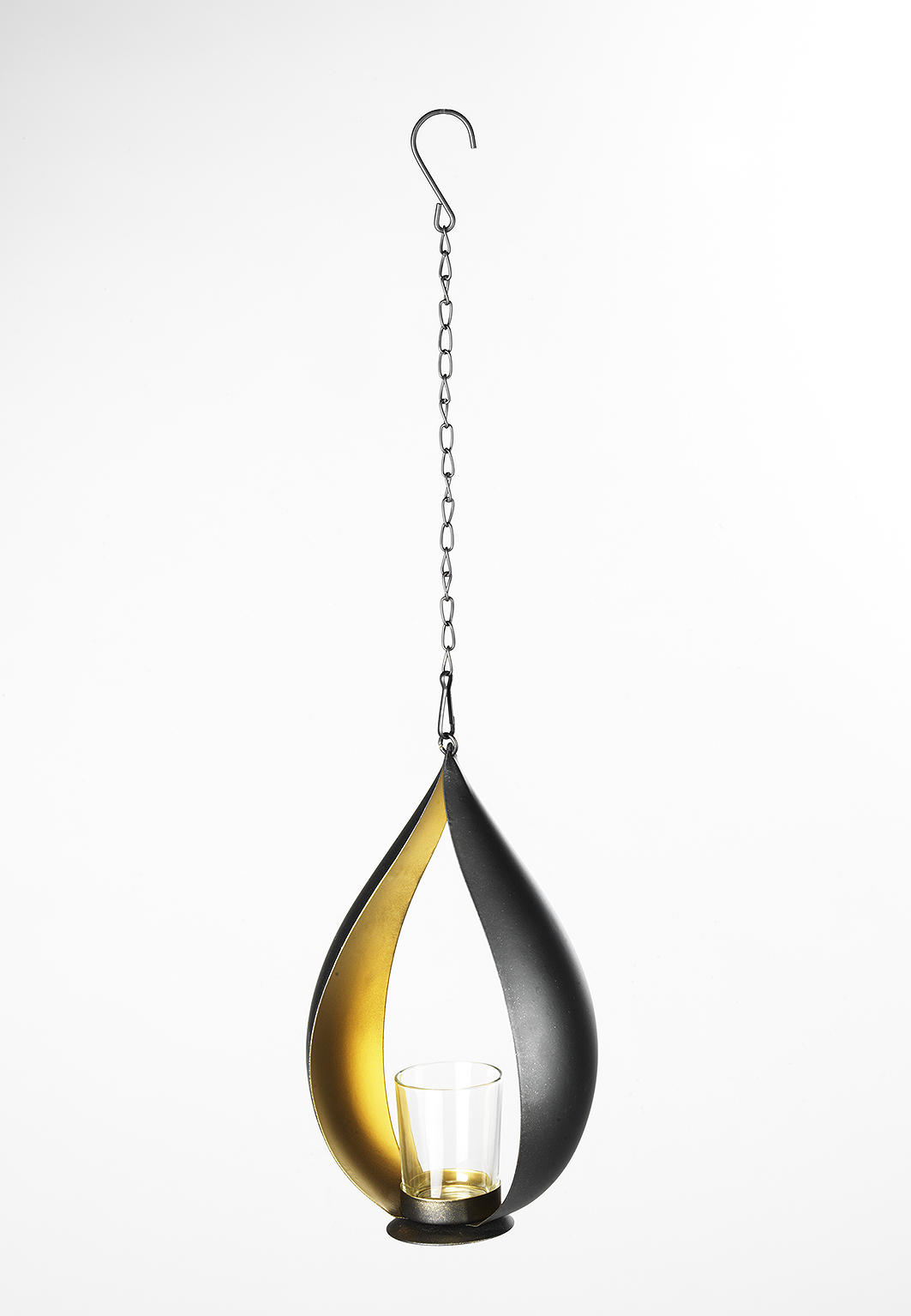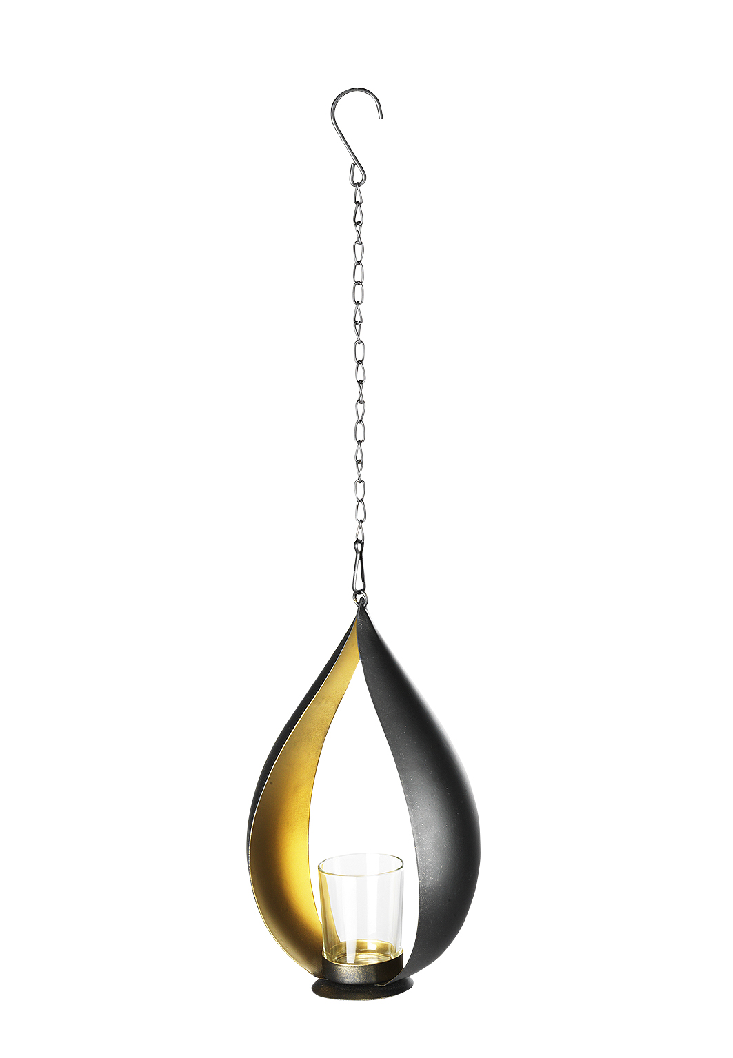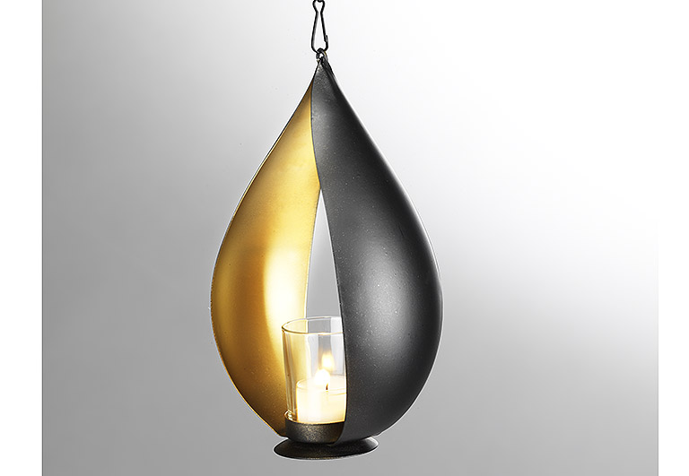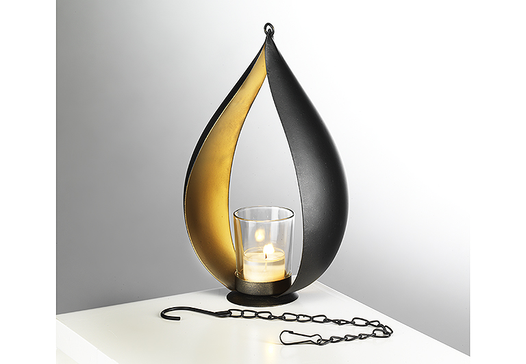 Der Teelichthalter von Kobolo ist aus schwarzem Metall gefertigt und kann durch die sowohl praktische als auch dekorative Kette problemlos aufgehängt werden. Die exquisite Kombination aus Schwarz und Gold machen den metallenen Teelichthalter zu einem Highlight jeder Dekoration. Länge 14cm x Breite 9cm x Höhe 25cm