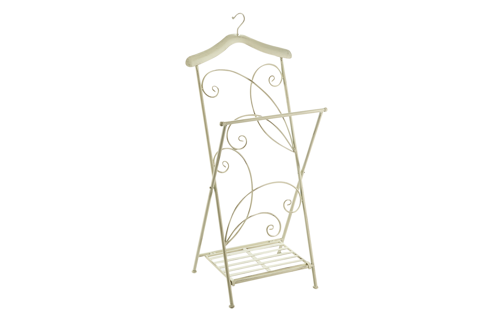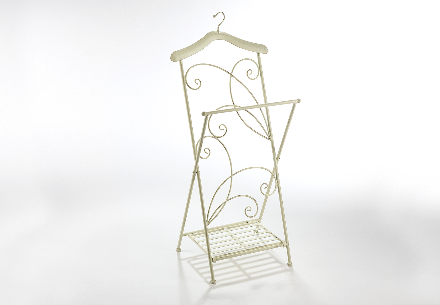 Vielseitiger stummer Diener oder Herrendiener aus Metall von Kobolo. Sie können diesen Haushaltshelfer vielseitig einsetzen. Ordnung schafft er in jedem Fall. Er besticht durch seine Metallornamente und die Lackierung im Vintage-Stil. Länge 40cm x Breite 34cm x Höhe 101cm