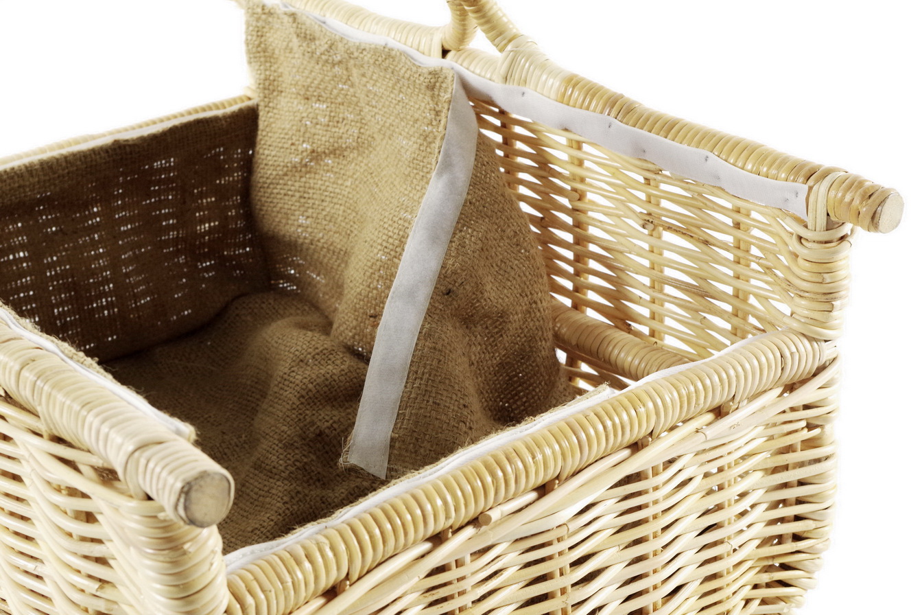 Wenn Sie Kaminholz in Ihrem Wohnraum lagern wollen, benötigen Sie einen Holzkorb, welcher sowohl in praktischer und dekorativer Hinsicht ein attraktiver Einrichtungsgegenstand sein sollte. Unsere Kaminkörbe von Kobolo aus Rattan sind besonders schöne, natürliche und sehr robuste Kaminholzkörbe in ansprechender Form. Der Juteeinsatz ist durch einen Klettverschluss abnehmbar und schützt ihre Wohnung vor Holzrückständen. Rattan ist aufgrund seiner natürlichen Beschaffenheit noch immer ein sehr beliebter Werkstoff zur Herstellung von Korbwaren und durch seine hohe Belastbarkeit bietet es Eigenschaften, die denen vieler anderer Materialien überlegen sind. Länge 61cm x Breite 46cm x Höhe 30cm