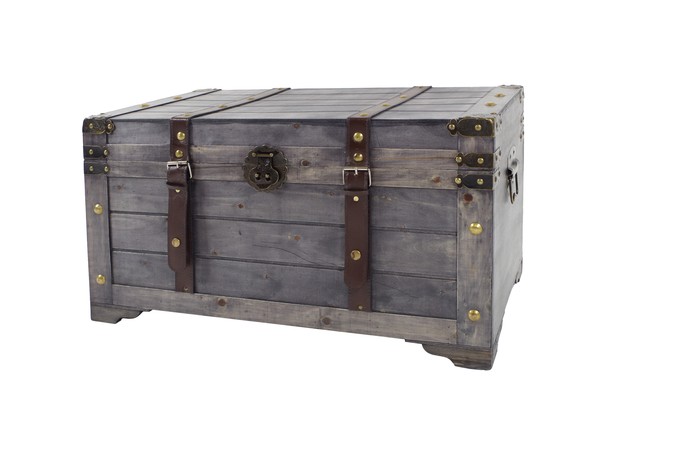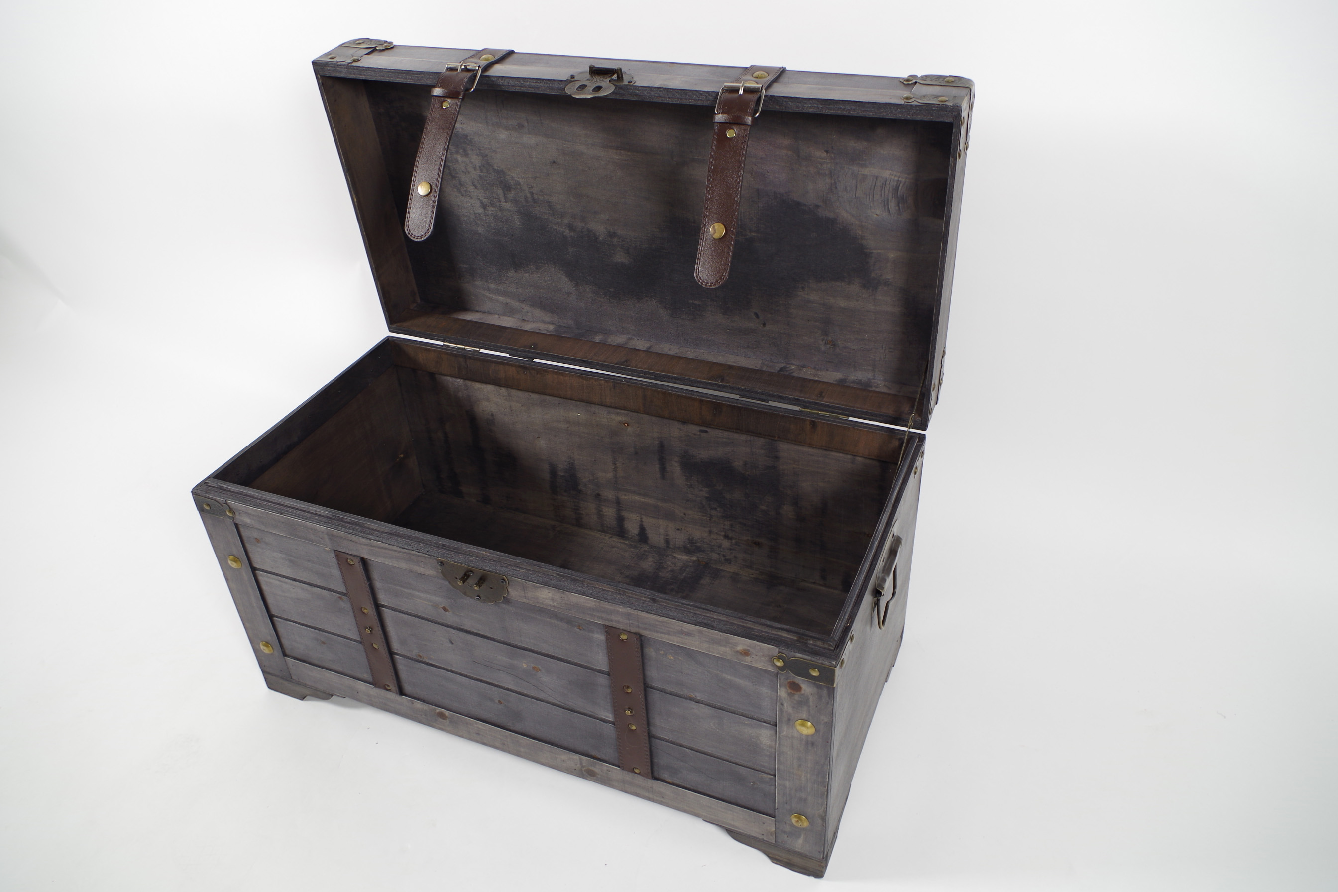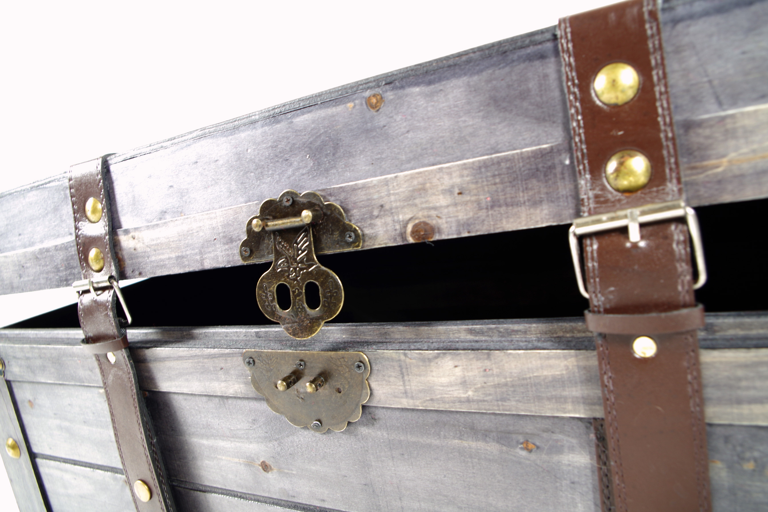 Edle Holztruhe im Schatztruhendesign von Kobolo. Diese schöne Holztruhe besticht durch Zierverschlüsse, Schnallen und Applikationen, die den Antik-Look unterstreichen. Außerdem bietet die Truhe Stauraum für verschiedenste Dinge. Material: Sperrholz Länge 70cm x Breite 35cm x Höhe 38cm