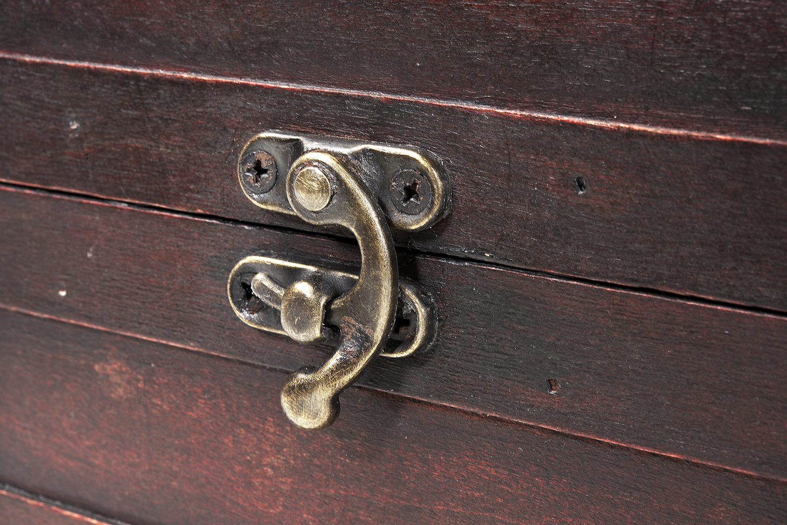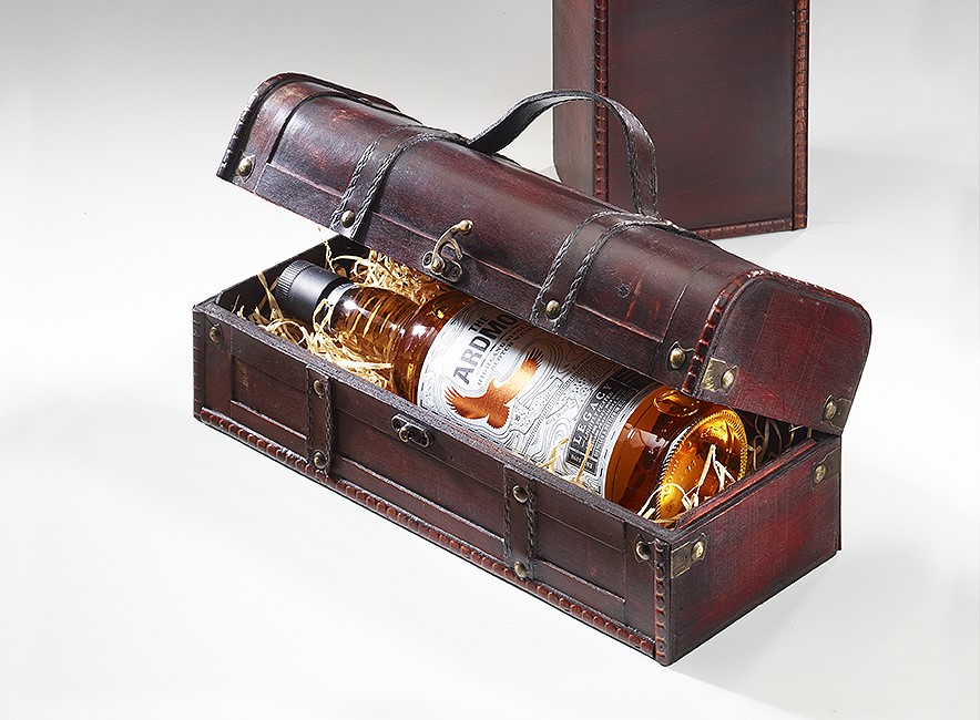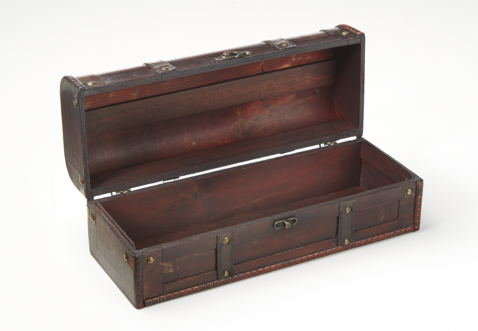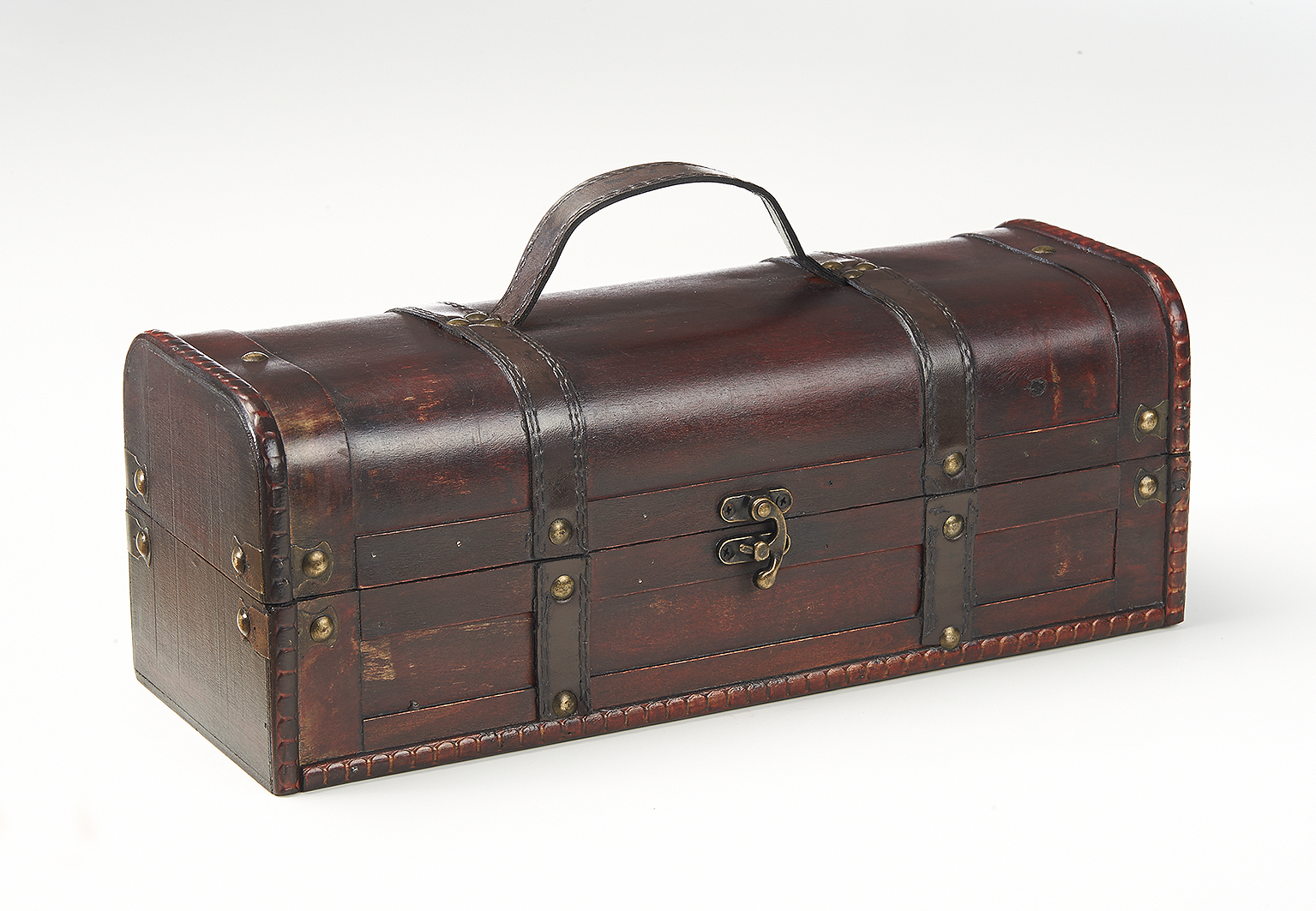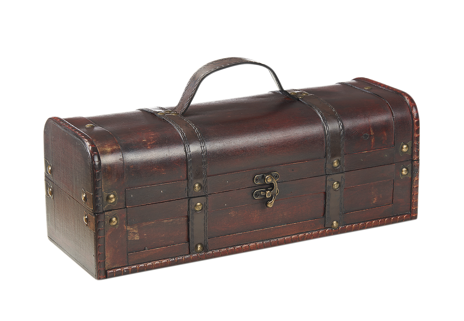 Edle Holztruhe im Schatztruhendesign von Kobolo. Diese schöne Holztruhe besticht durch Zierverschlüsse, Schnallen und Applikationen, die den Antik-Look unterstreichen. Außerdem bietet die Truhe Stauraum für verschiedenste Dinge. Als Verpackung für eine Flasche ein Hingucker und als Geschenk ein echtes Highlight, ohne Deko. Länge 35cm x Breite 13cm x Höhe 13cm