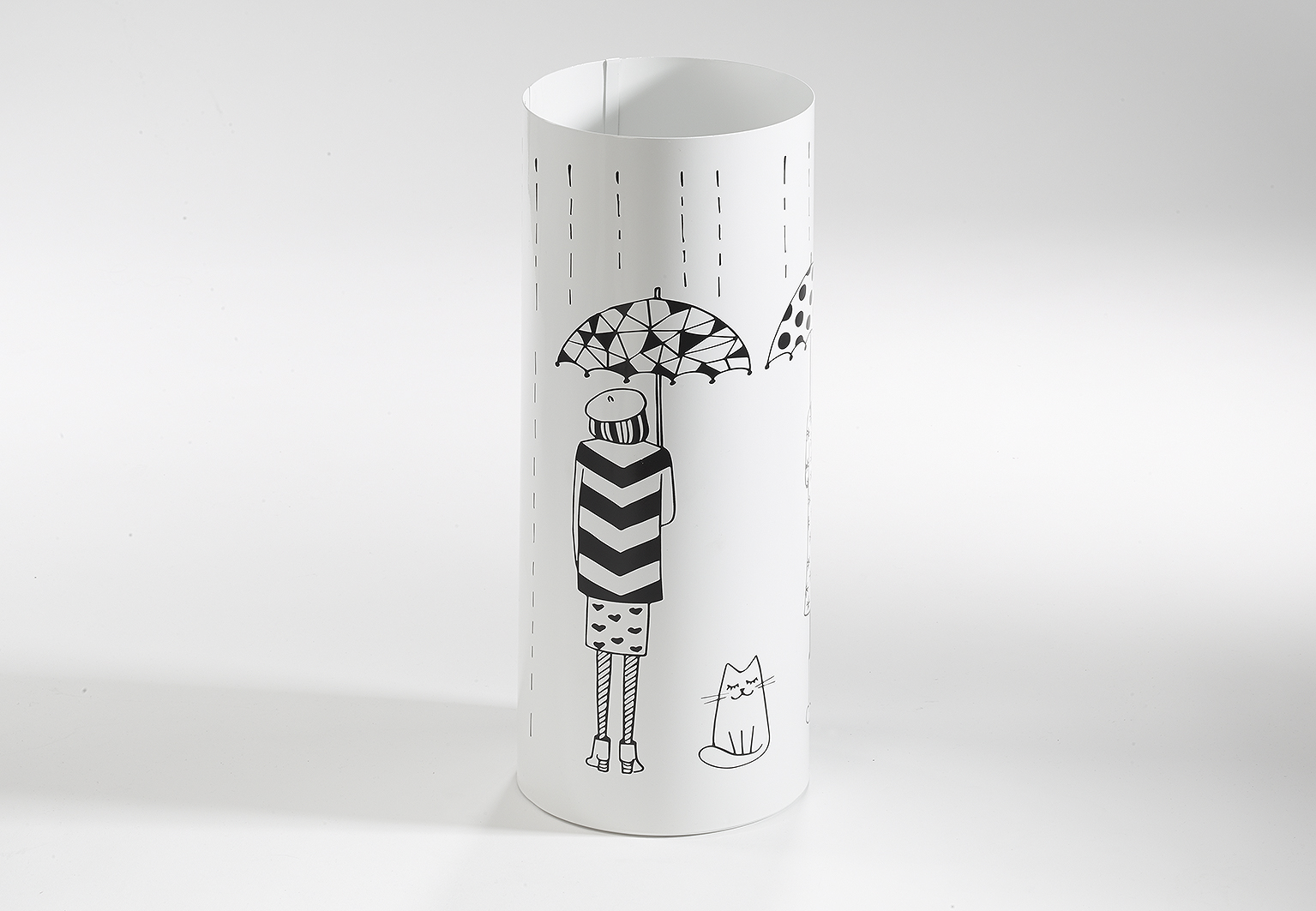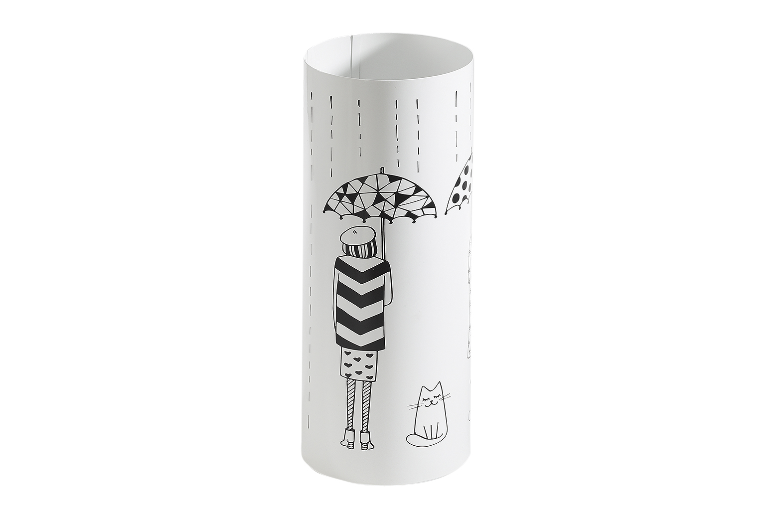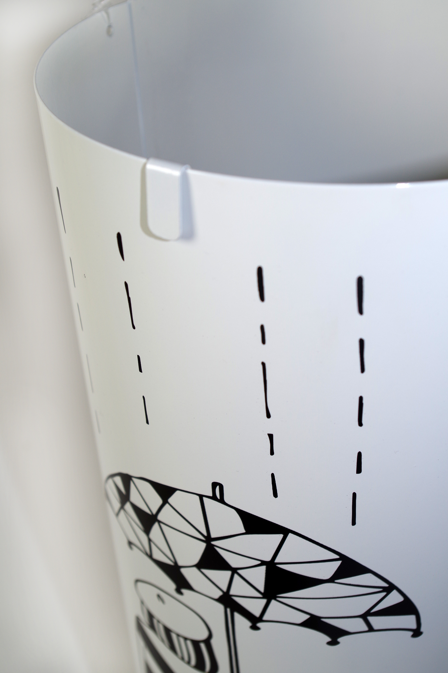 Schirmständer COMIC aus Metall von Kobolo. In edlem Weiß lackiert mit aufgedruckten Zeichnungen. Ein moderner Blickfang für jeden Eingangsbereich. Inklusive Abtropfschale aus Kunststoff und einem Haken für kleine Schirme/Knirpse. Wird ohne Deko geliefert.Durchmesser 20cm x Höhe 48cm