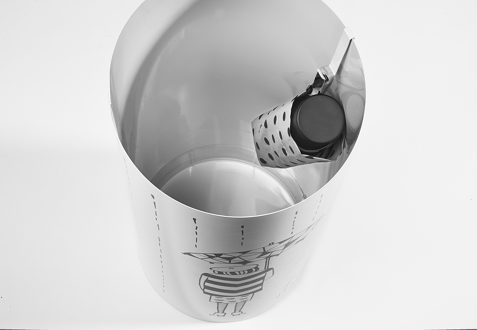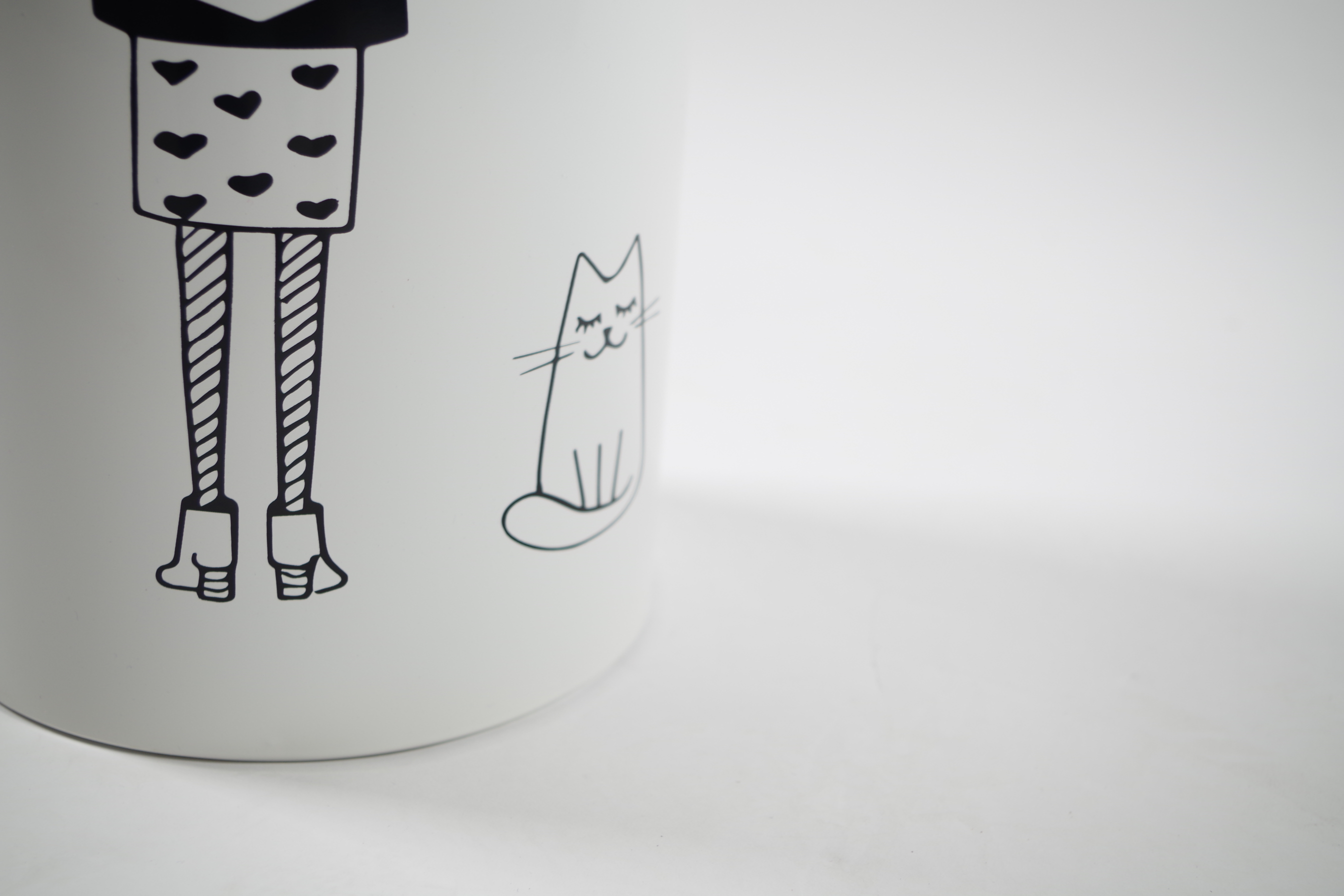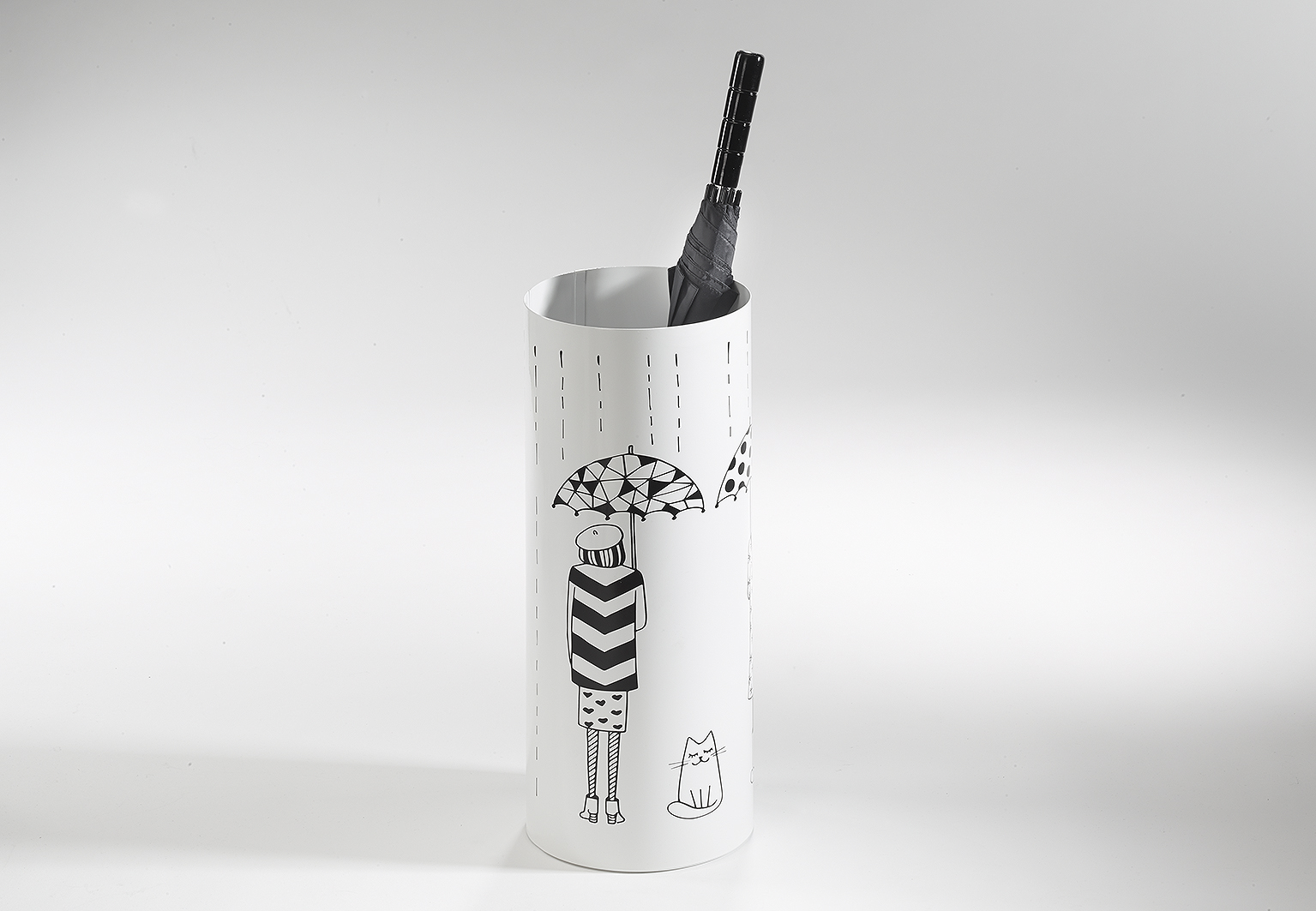 Schirmständer COMIC aus Metall von Kobolo. In edlem Weiß lackiert mit aufgedruckten Zeichnungen. Ein moderner Blickfang für jeden Eingangsbereich. Inklusive Abtropfschale aus Kunststoff und einem Haken für kleine Schirme/Knirpse. Wird ohne Deko geliefert.Durchmesser 20cm x Höhe 48cm