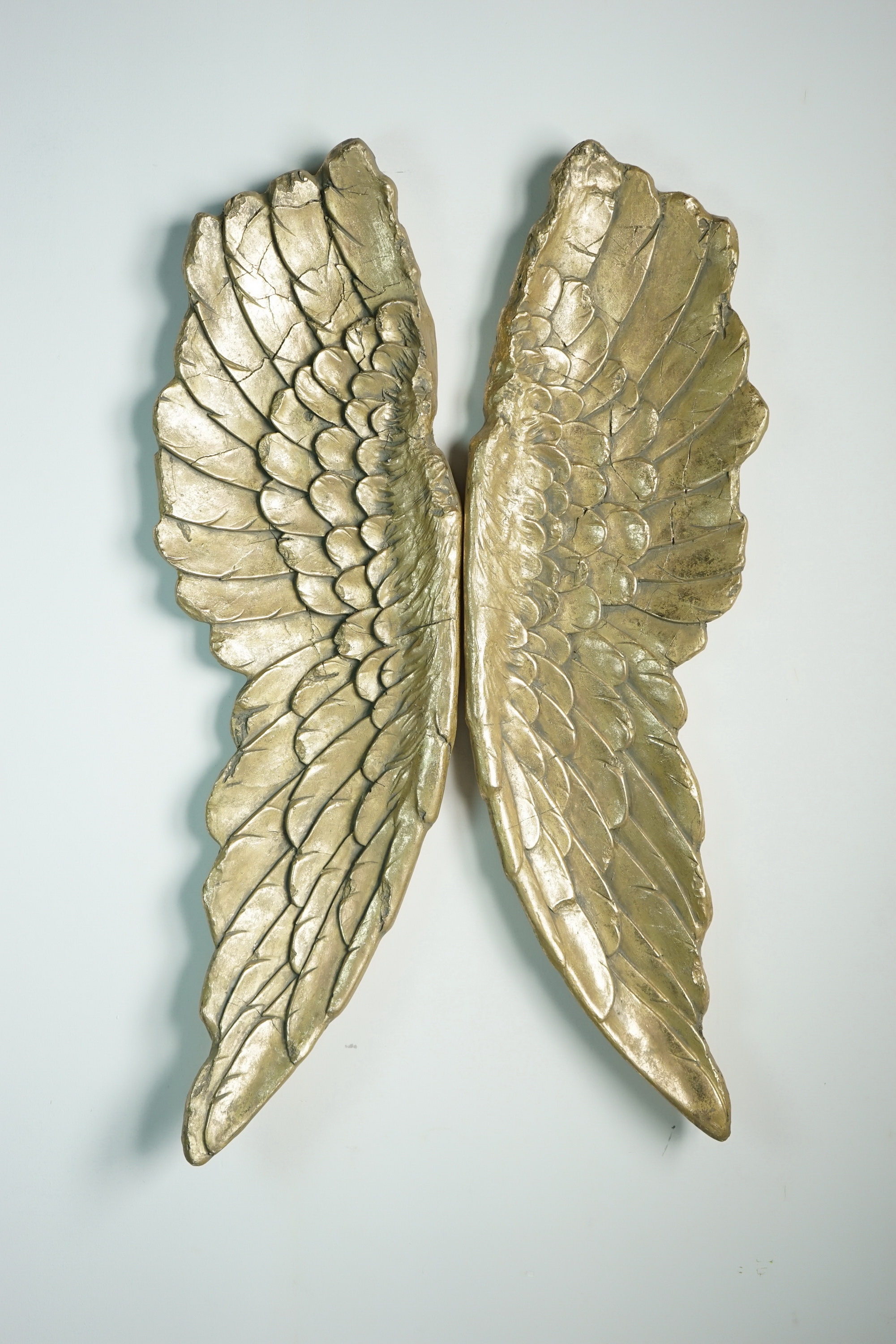 Imposante Wanddekoration bestehend aus zwei goldenen Engelsflügeln von Kobolo. Dieser prachtvolle Wandschmuck zaubert ein elegantes Ambiente in ihr Zuhause. Ein traumhaft schöner und stilvoller Eyecatcher, der auch als originelles Geschenk ein echtes Highlight ist. Die Dekoflügel werden aus Kunststein/Polyresin gefertigt und kunstvoll in Handarbeit bemalt, die Maßangaben verstehen sich pro Flügel. Länge 32cm x Breite 8cm x Höhe 105cm