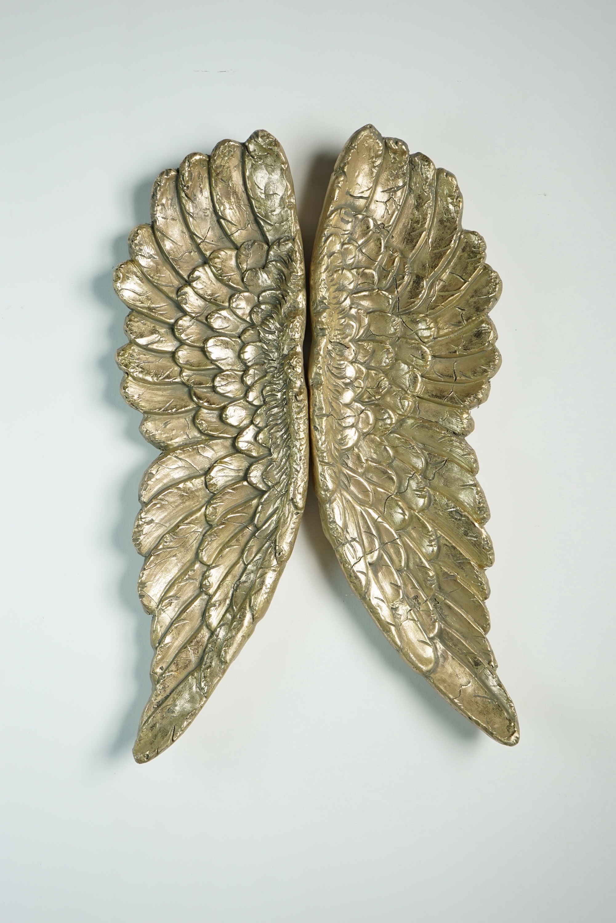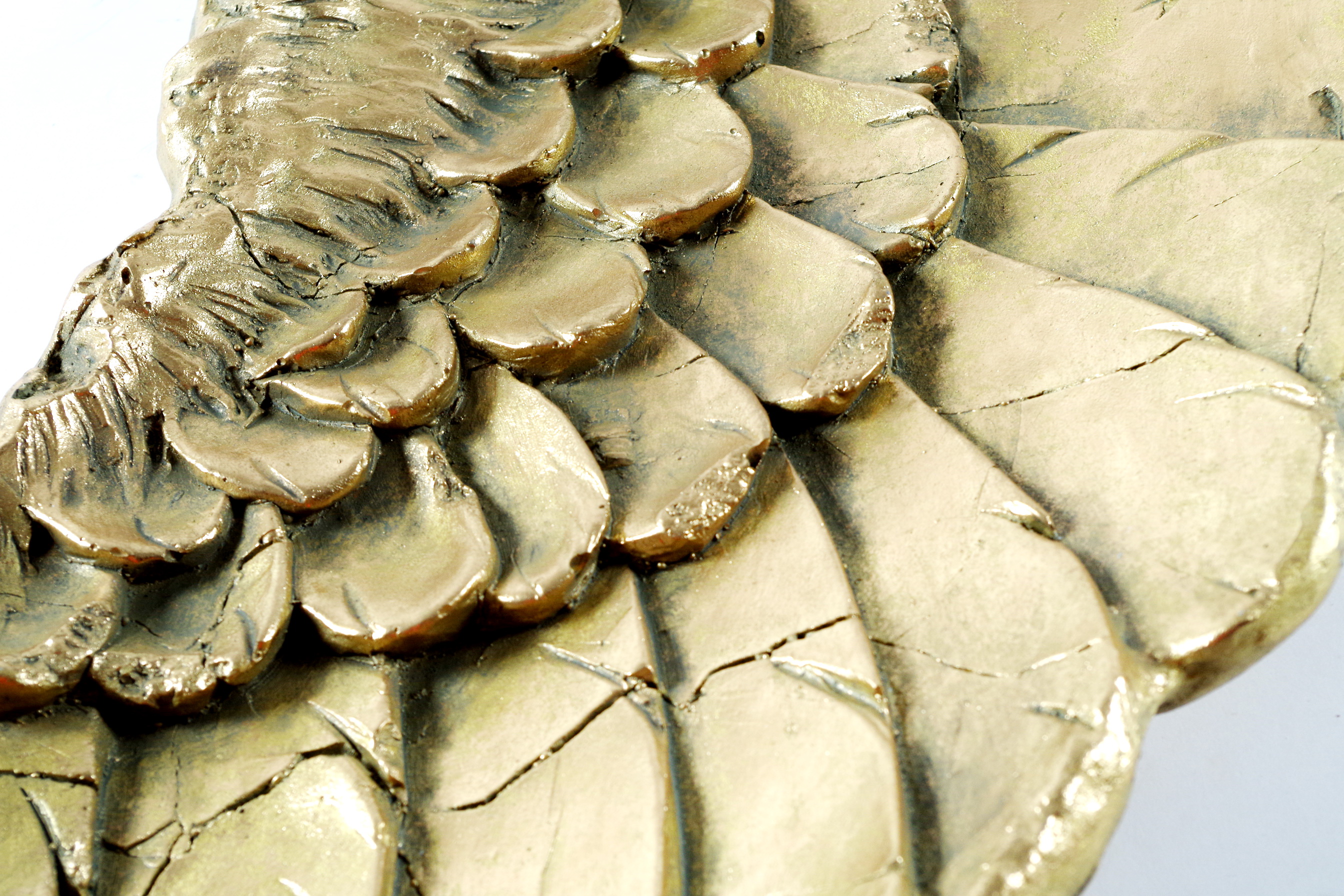 Imposante Wanddekoration bestehend aus zwei goldenen Engelsflügeln von Kobolo. Dieser prachtvolle Wandschmuck zaubert ein elegantes Ambiente in ihr Zuhause. Ein traumhaft schöner und stilvoller Eyecatcher, der auch als originelles Geschenk ein echtes Highlight ist. Die Dekoflügel werden aus Kunststein/Polyresin gefertigt und kunstvoll in Handarbeit bemalt, die Maßangaben verstehen sich pro Flügel. Länge 19cm x Breite 6cm x Höhe 62cm