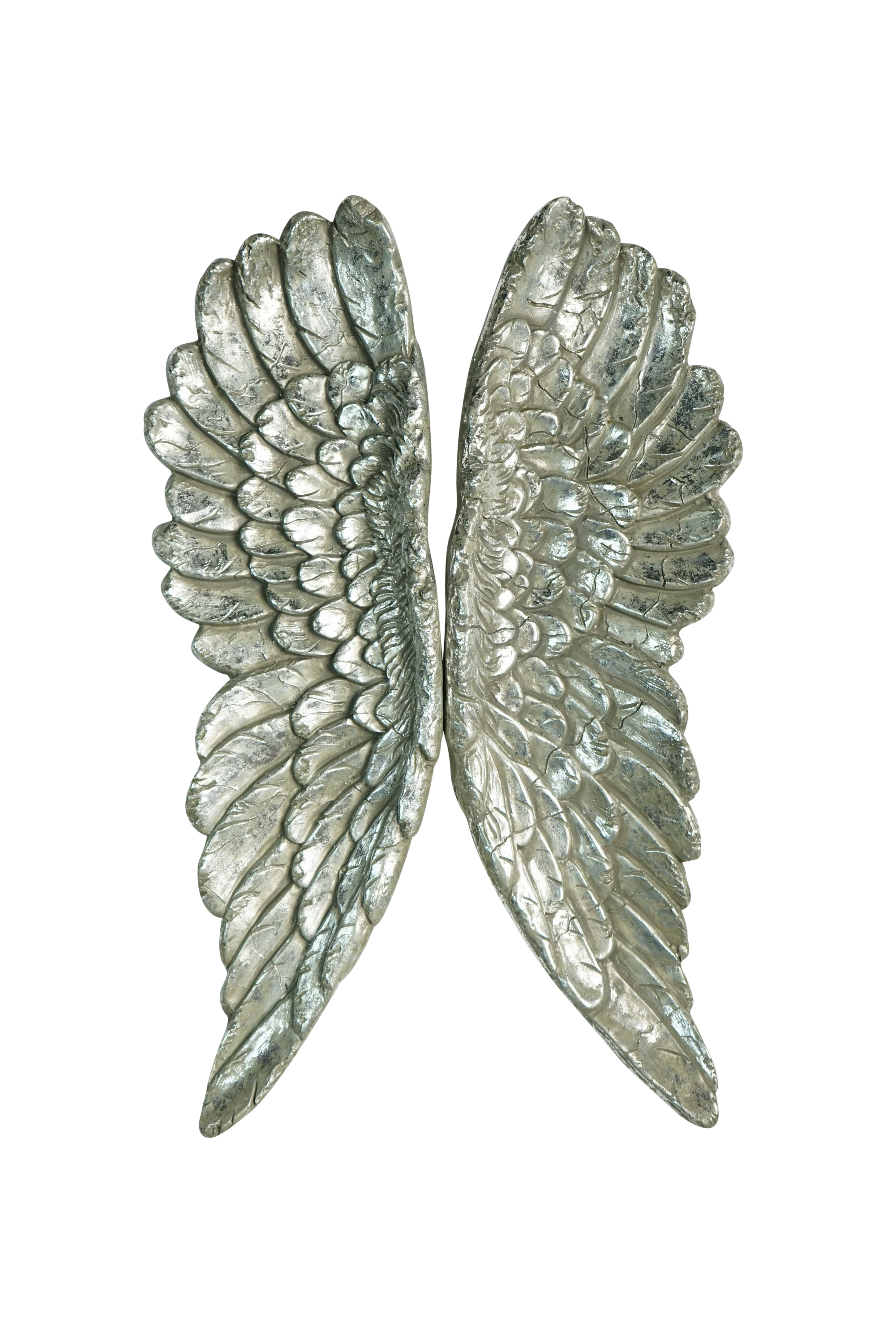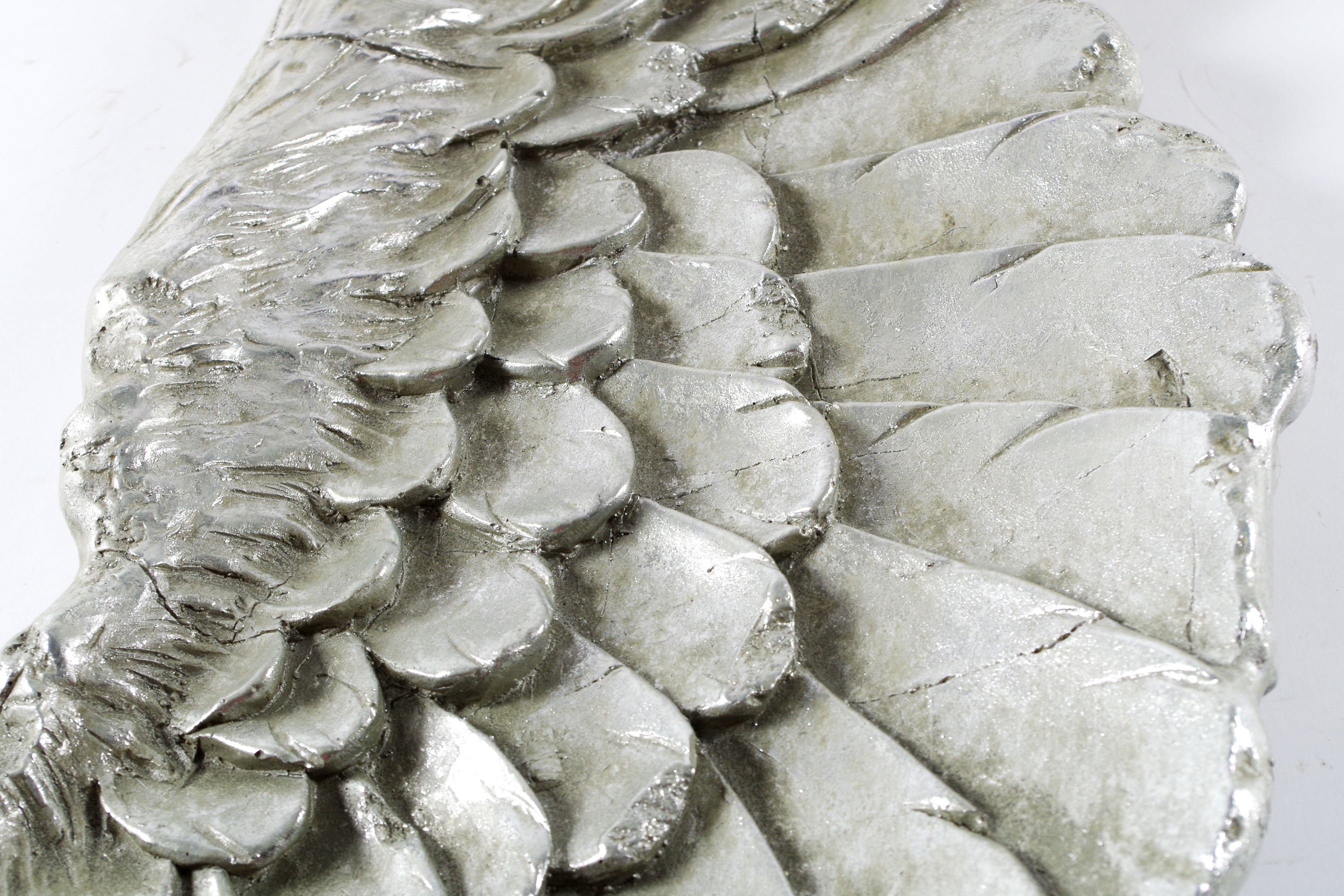 Imposante Wanddekoration bestehend aus zwei silbernen Engelsflügeln von Kobolo. Dieser prachtvolle Wandschmuck zaubert ein elegantes Ambiente in ihr Zuhause. Ein traumhaft schöner und stilvoller Eyecatcher, der auch als originelles Geschenk ein echtes Highlight ist. Die Dekoflügel werden aus Kunststein/Polyresin gefertigt und kunstvoll in Handarbeit bemalt, die Maßangaben verstehen sich pro Flügel. Länge 19cm x Breite 6cm x Höhe 62cm