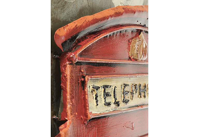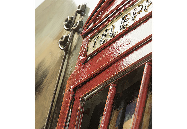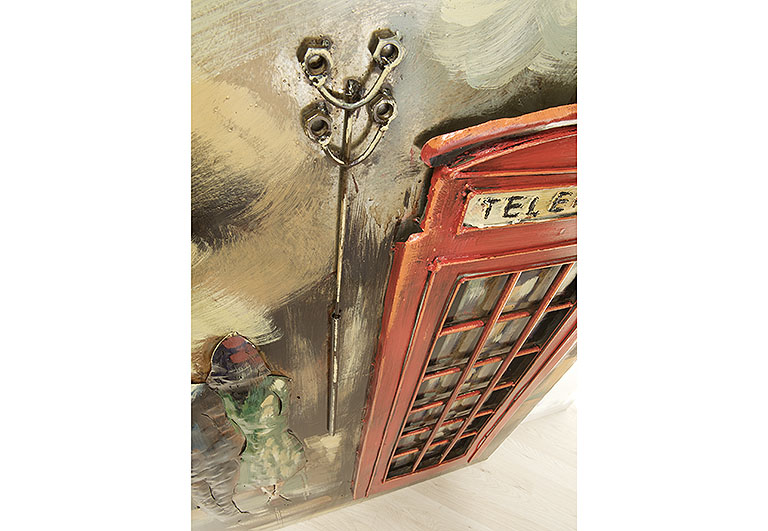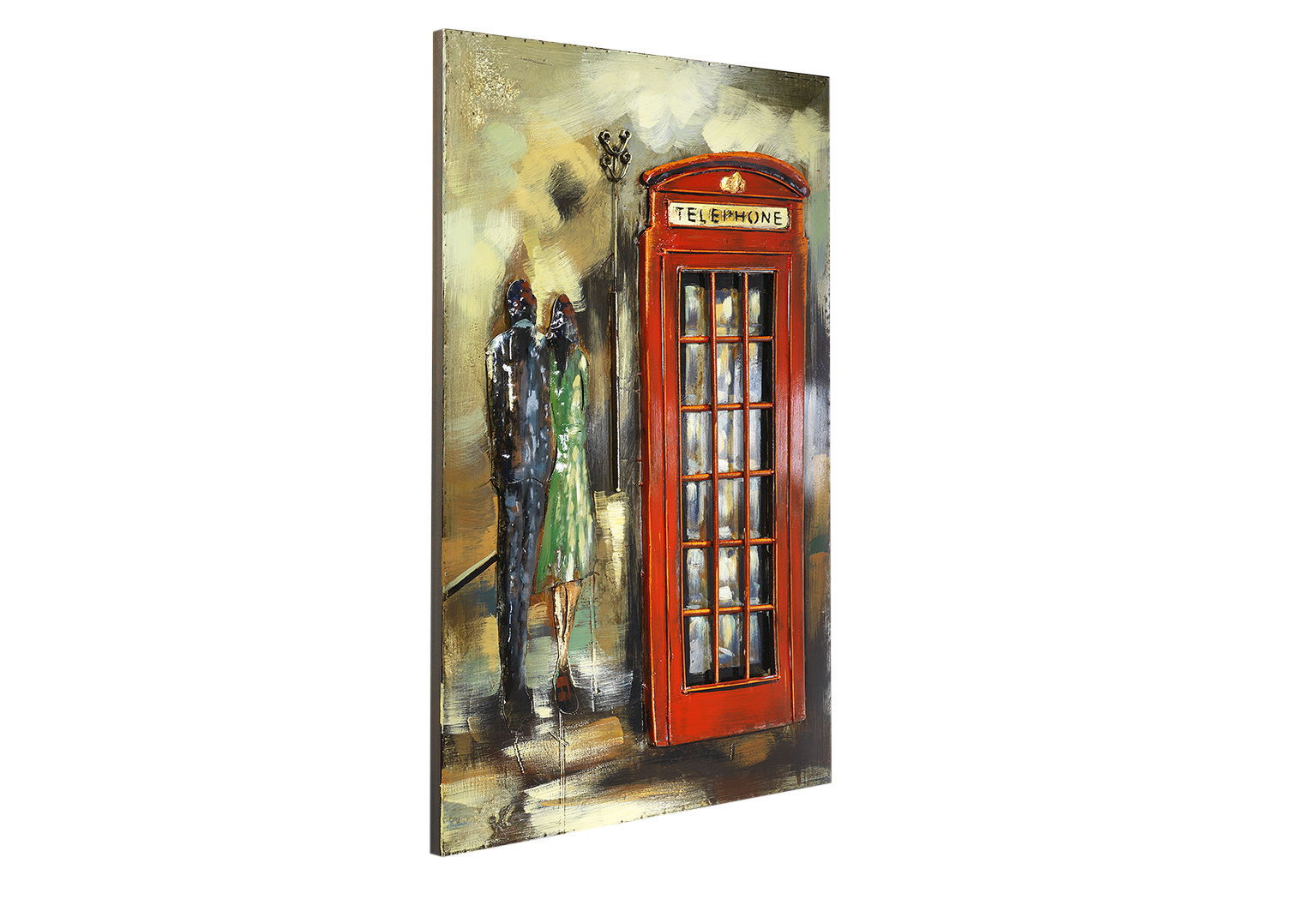 Das rechteckige Metallbild von Kobolo ist in gedeckten Farben gehalten und fügt sich so harmonisch in jedes Ambiente ein. Das Highlight des Wandbildes aus Metall ist das 3D Relief einer typisch englischen Telefonzelle in knalligem Rot. Länge 80cm x Breite 6cm x Höhe 120cm