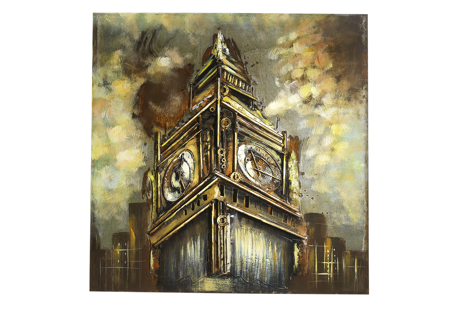 Das rechteckige Metallbild von Kobolo besticht durch eine harmonische Kombination verschiedener Erdtöne mit hellen Akzenten. Ein 3D Relief von Big Ben verleiht dem Wandbild aus Metall seinen besonderen Charme. Länge 100cm x Breite 7cm x Höhe 100cm
