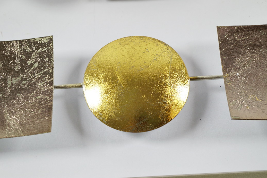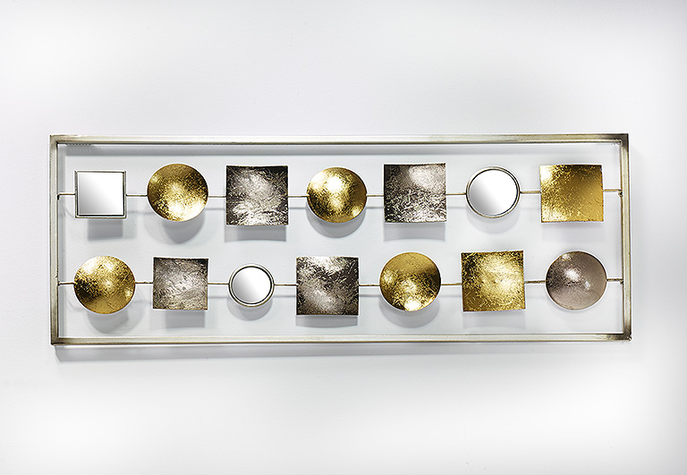 Die Wanddekoration aus Metall von Kobolo besticht durch ihre Schlichtheit und Eleganz. In Silbergrau gehalten mit Kreisen in gold und silber verschönert die Wanddekoration jedes Zuhause. Besonderer Clou sind die Spiegelelemente, die dem Metallwandbild seine individuelle Note verleihen. Länge 28cm x Breite 3cm x Höhe 74cm