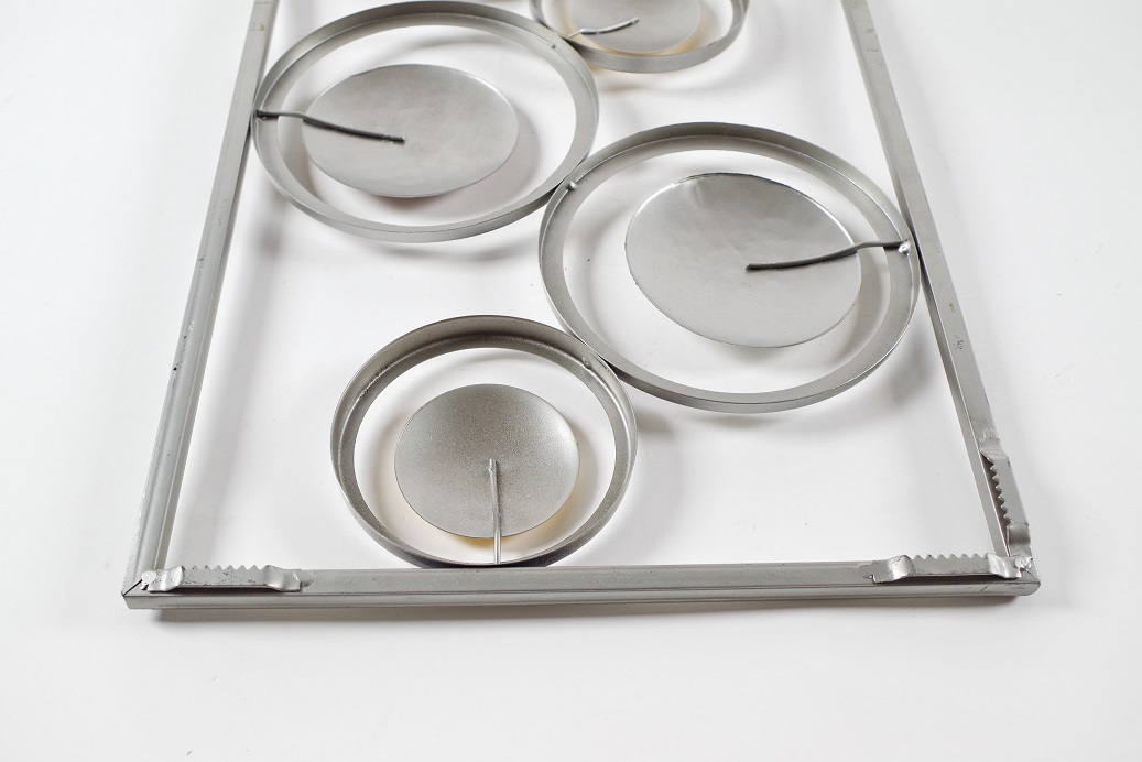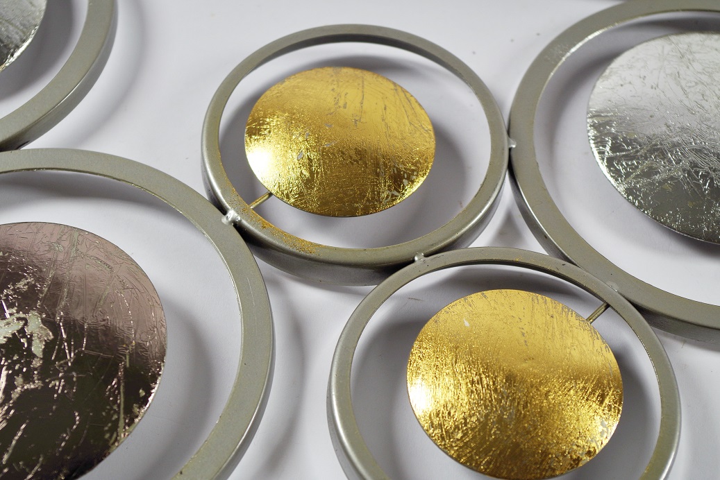 Die rechteckige Wanddekoration aus Metall von Kobolo überzeugt durch hervorragende Verarbeitung und formschönes Design. Durch die Kombination aus silberfarbenem Metall und verschieden großen Kreisen in gold, silber und grau erhält die Wanddekoration eine elegante Note und verschönert auf unaufdringliche Weise jedes Ambiente. Länge 31cm x Breite 2cm x Höhe 89cm