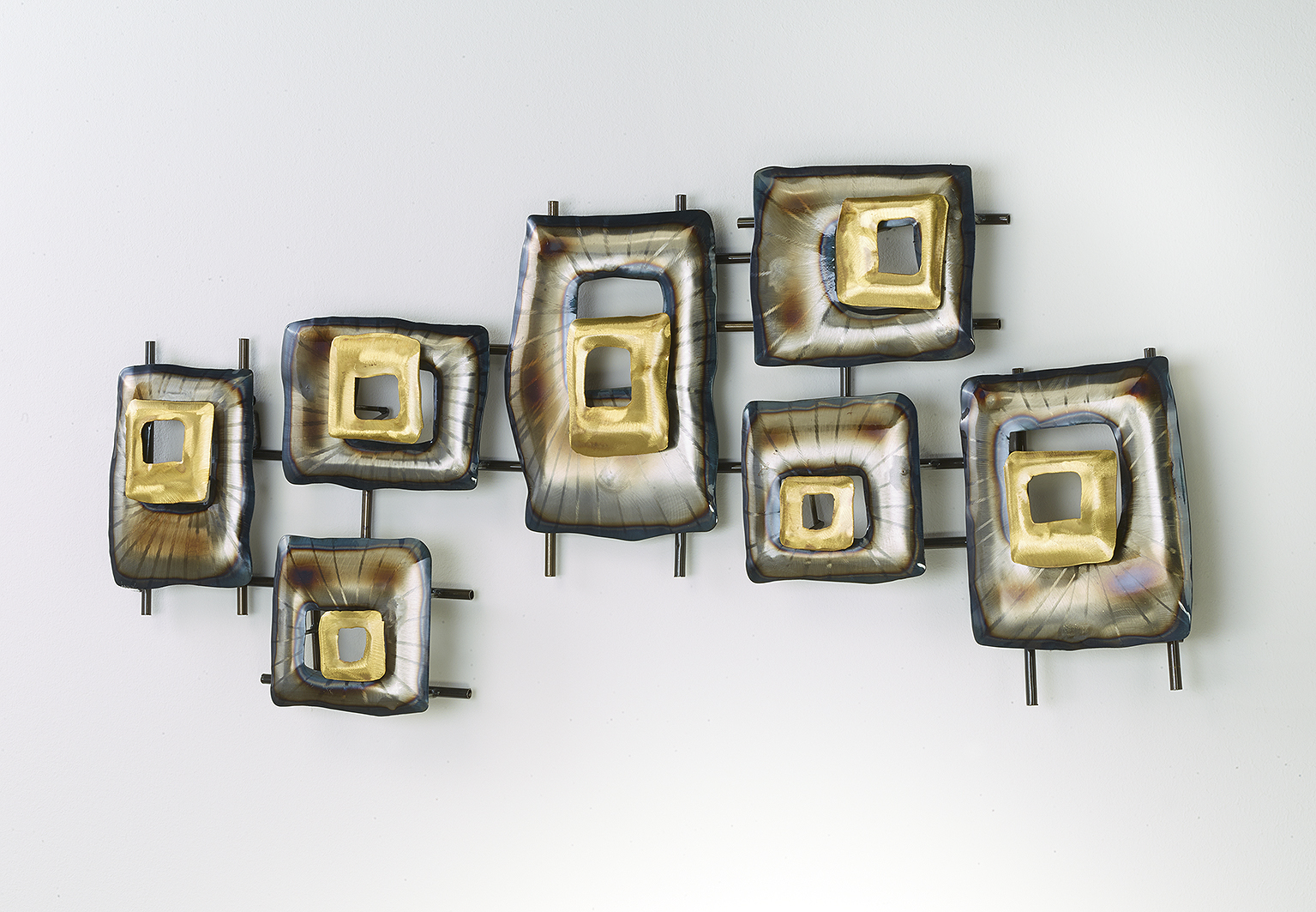 Das Wandbild von Kobolo überzeugt durch hervorragende Verarbeitung und edles Design. Es besteht aus mehreren Rechtecken, die durch Metallstränge miteinander verbunden und in einem offenen Gefüge arrangiert sind. Ganz in Gold und Silber gehalten, mit kupferfarbenen und metallic-blauen Details, verleiht die Metalldeko jedem Zuhause Stil und Individualität. Länge 78cm x Breite 36cm x Höhe 5cm